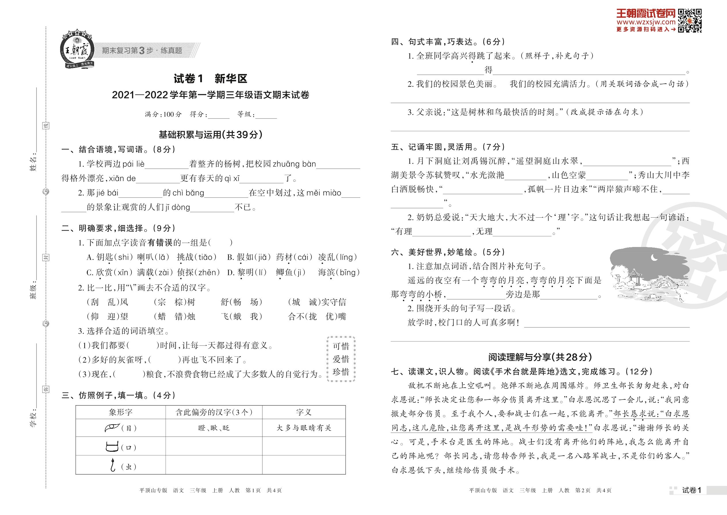 新华区2021—2022学年第一学期三年级语文期末试卷(人教版)【1】