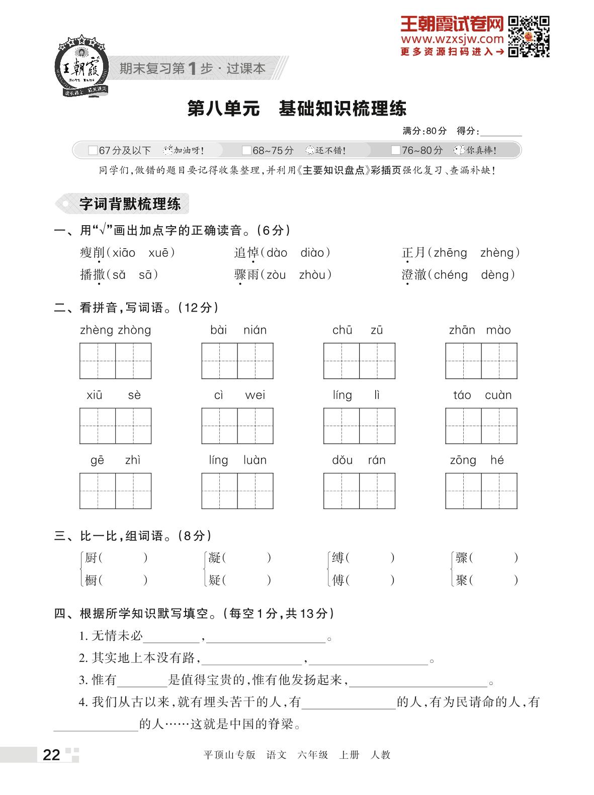 王朝霞期末过课本——第八单元 基础知识梳理练六年级上册语文(人教版)_R221127181254267