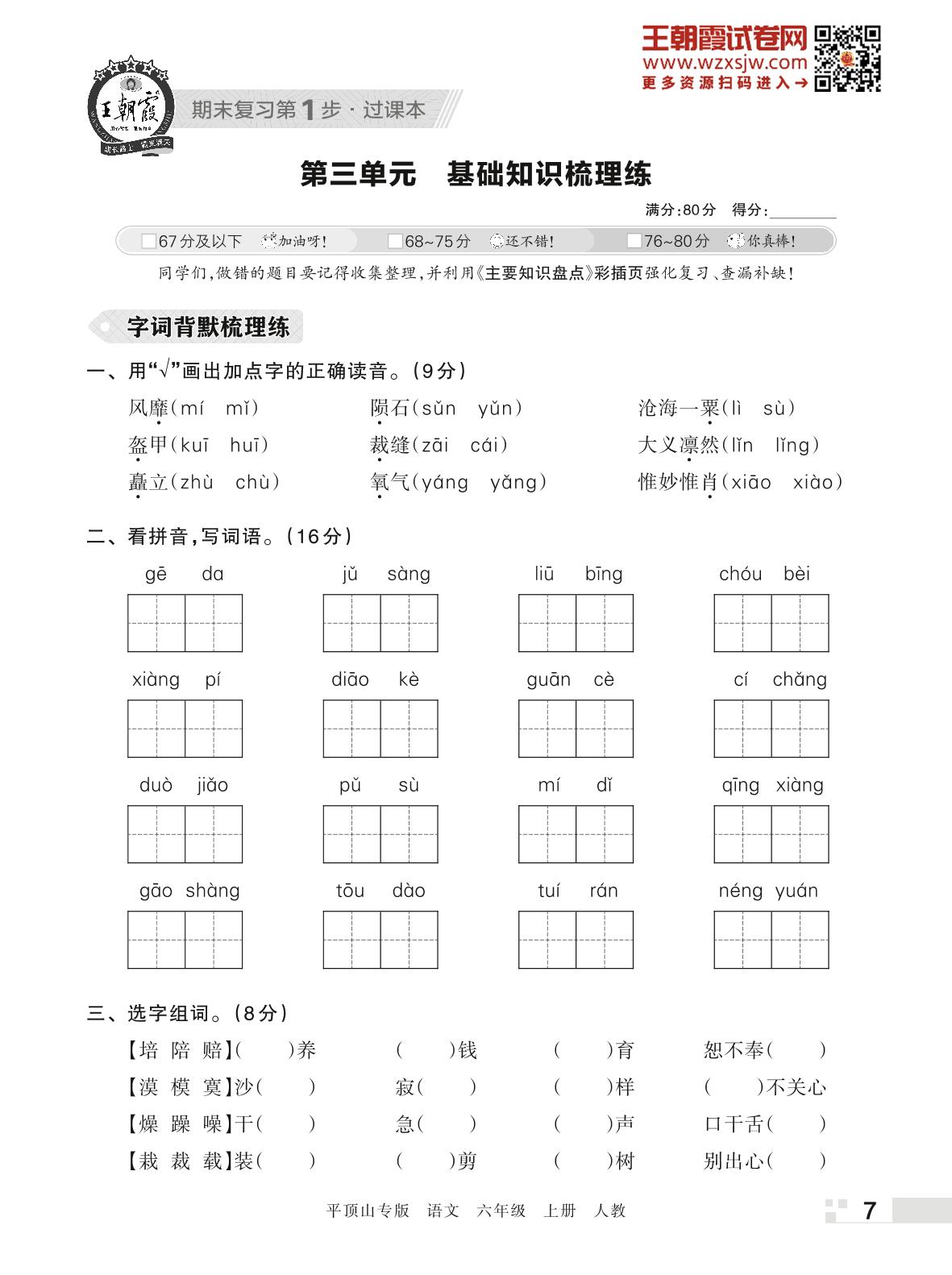 王朝霞期末过课本——第三单元 基础知识梳理练六年级上册语文(人教版)_R221127181255123