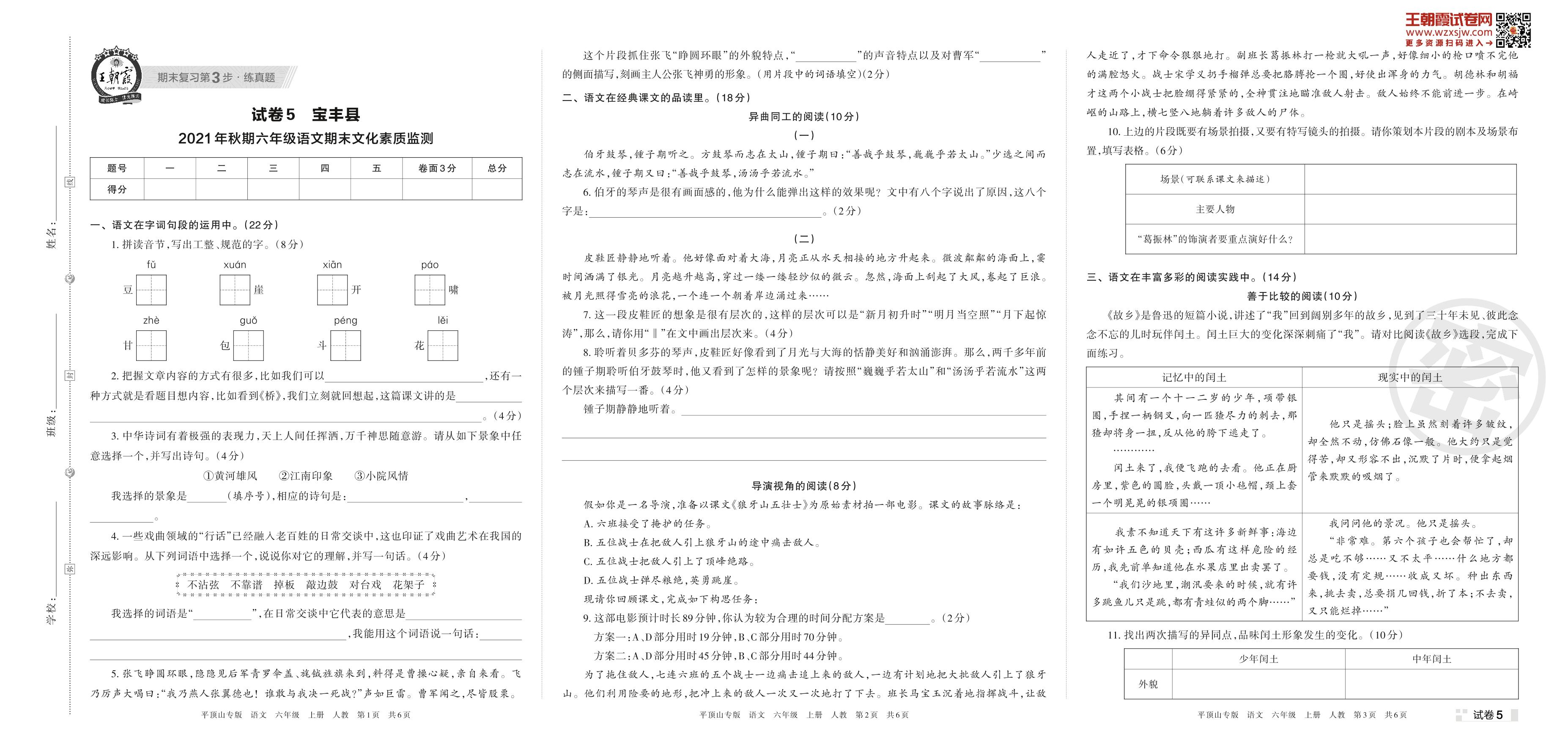 宝丰县2021年秋期六年级语文期末文化素质监测(人教版)【5】
