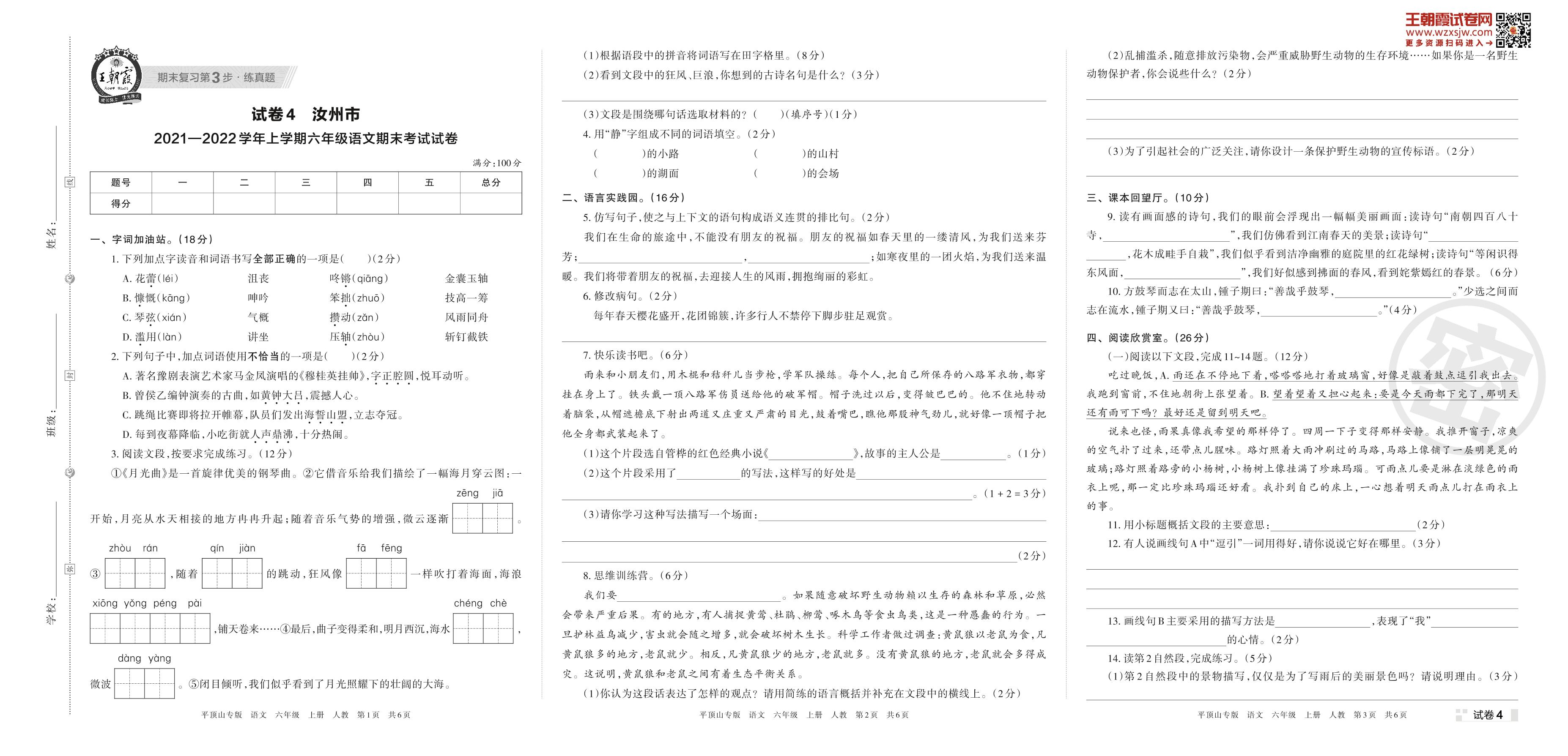 汝州市2021—2022学年上学期六年级语文期末考试试卷(人教版)【4】