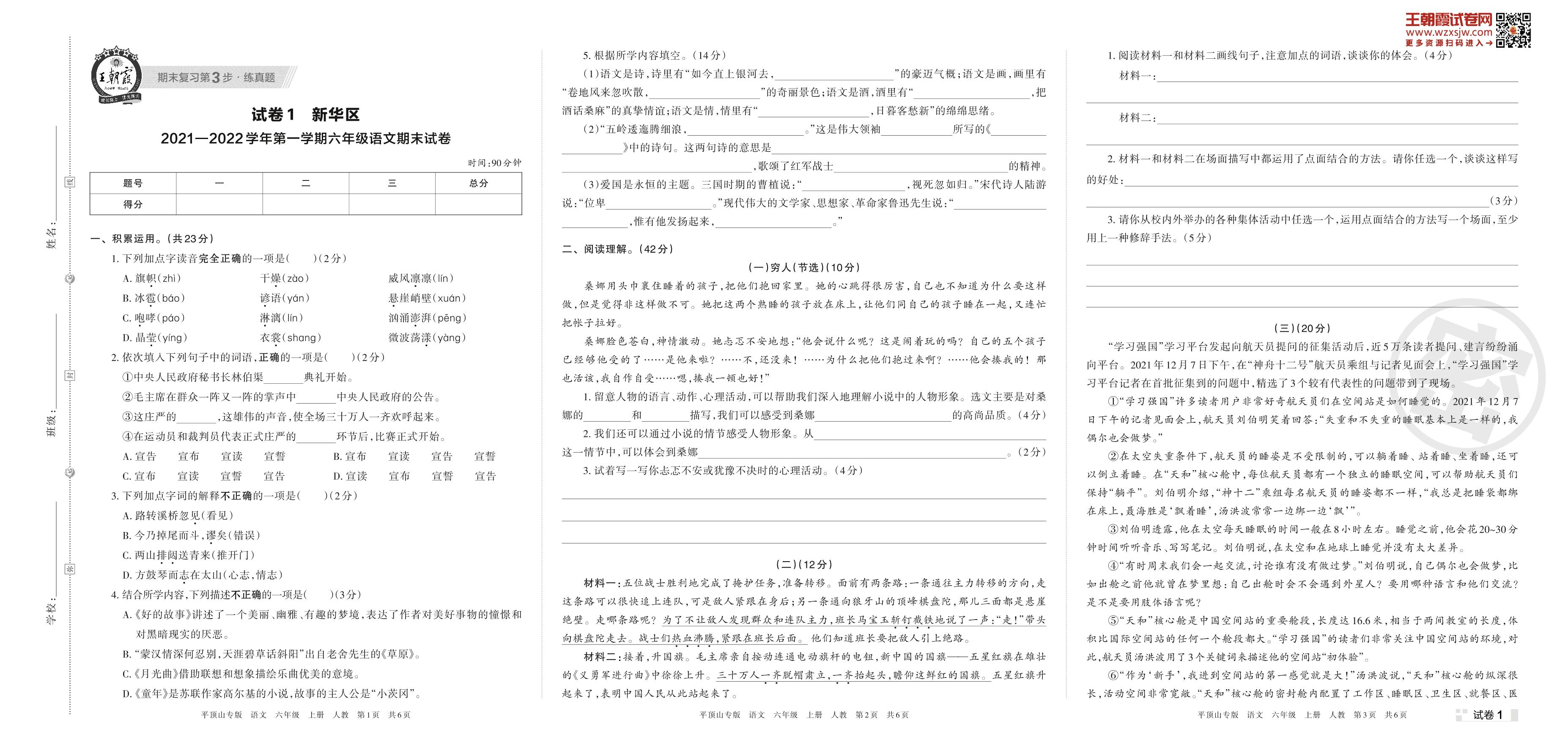 新华区2021—2022学年第一学期六年级语文期末试卷(人教版)【1】