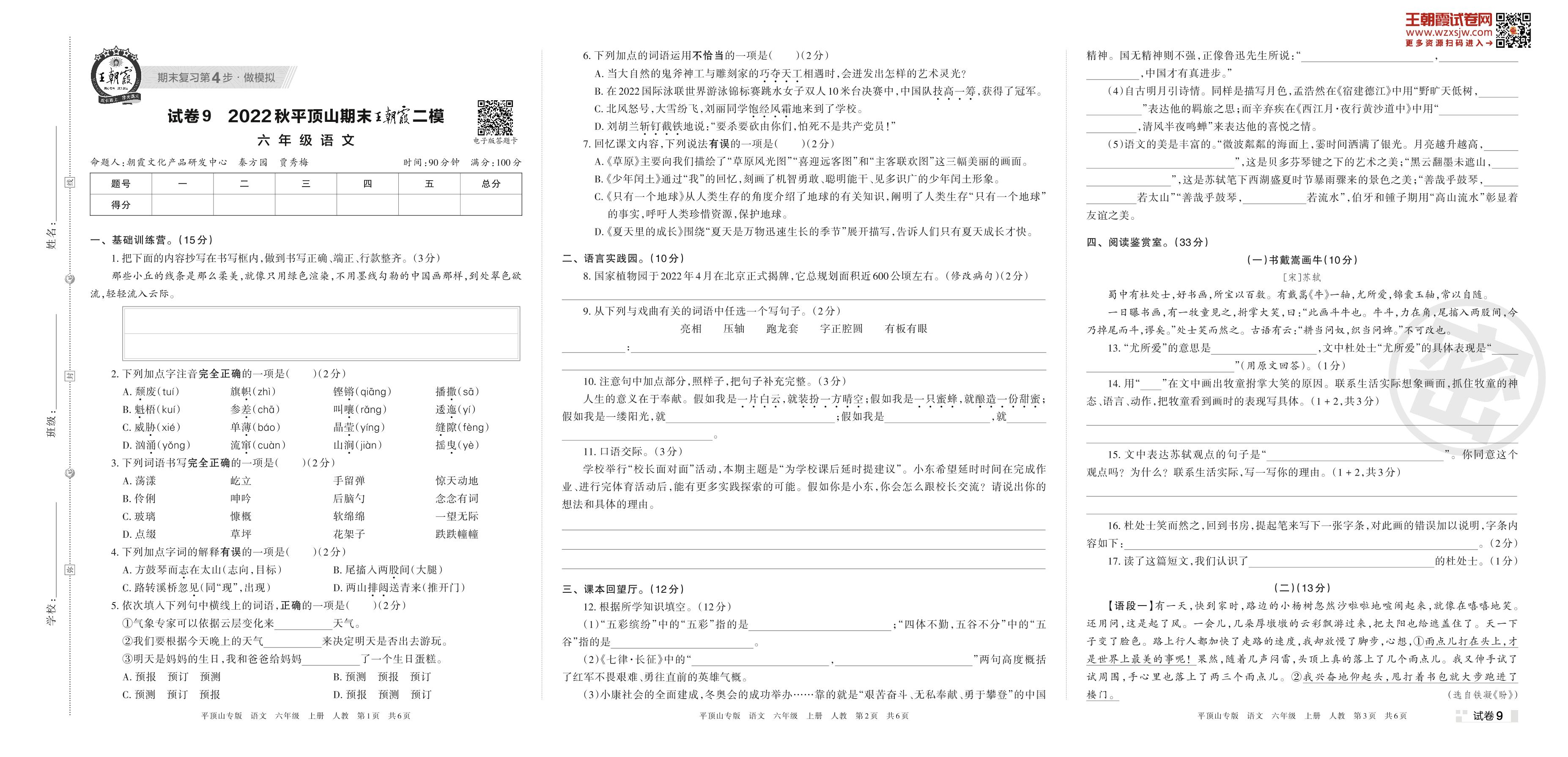 王朝霞期末模拟卷六年级上册语文(人教版)_R221127181257226【9】