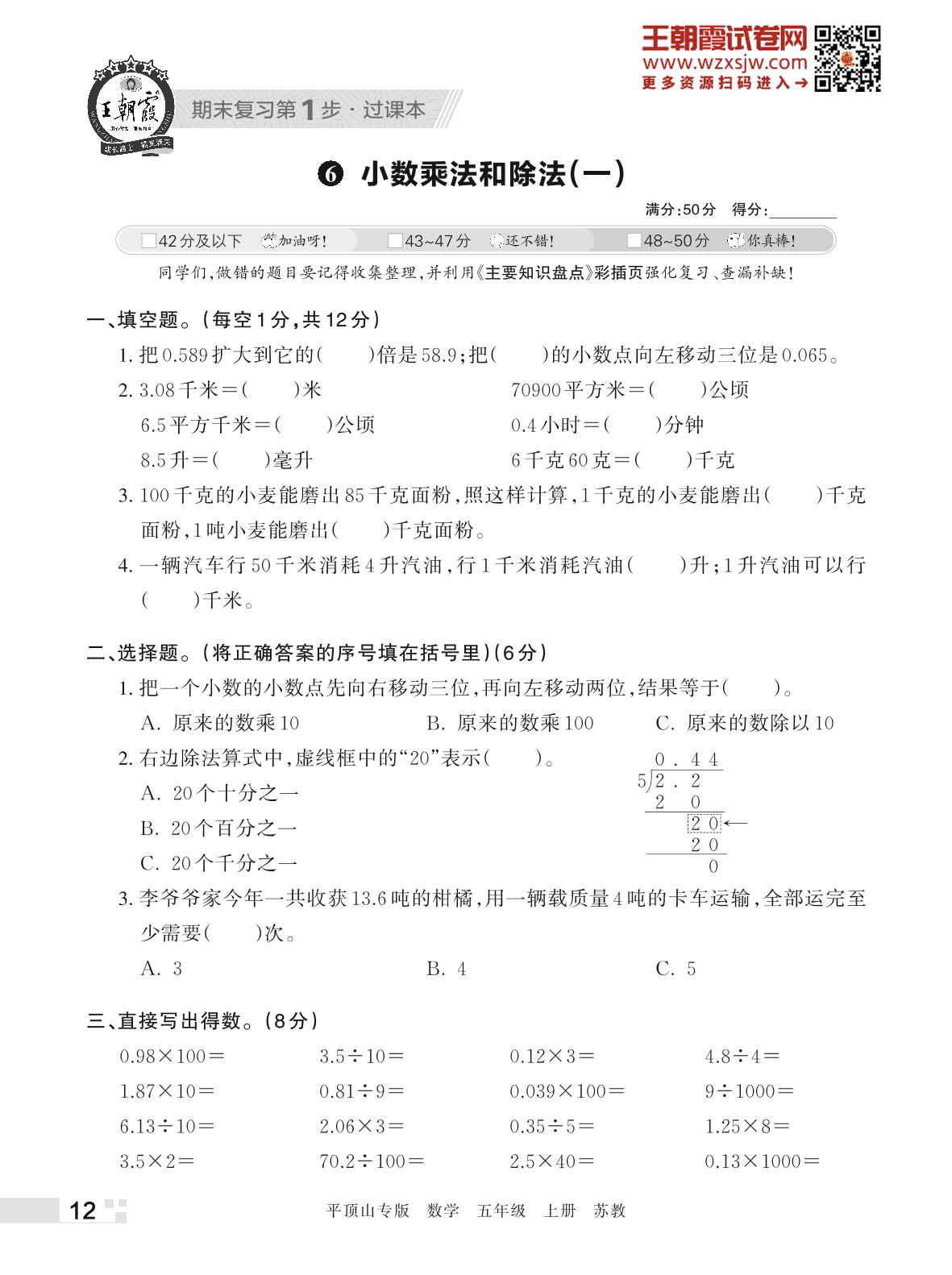 王朝霞期末过课本——6 小数乘法和除法(一)五年级上册数学(苏教版)_R221128135631751