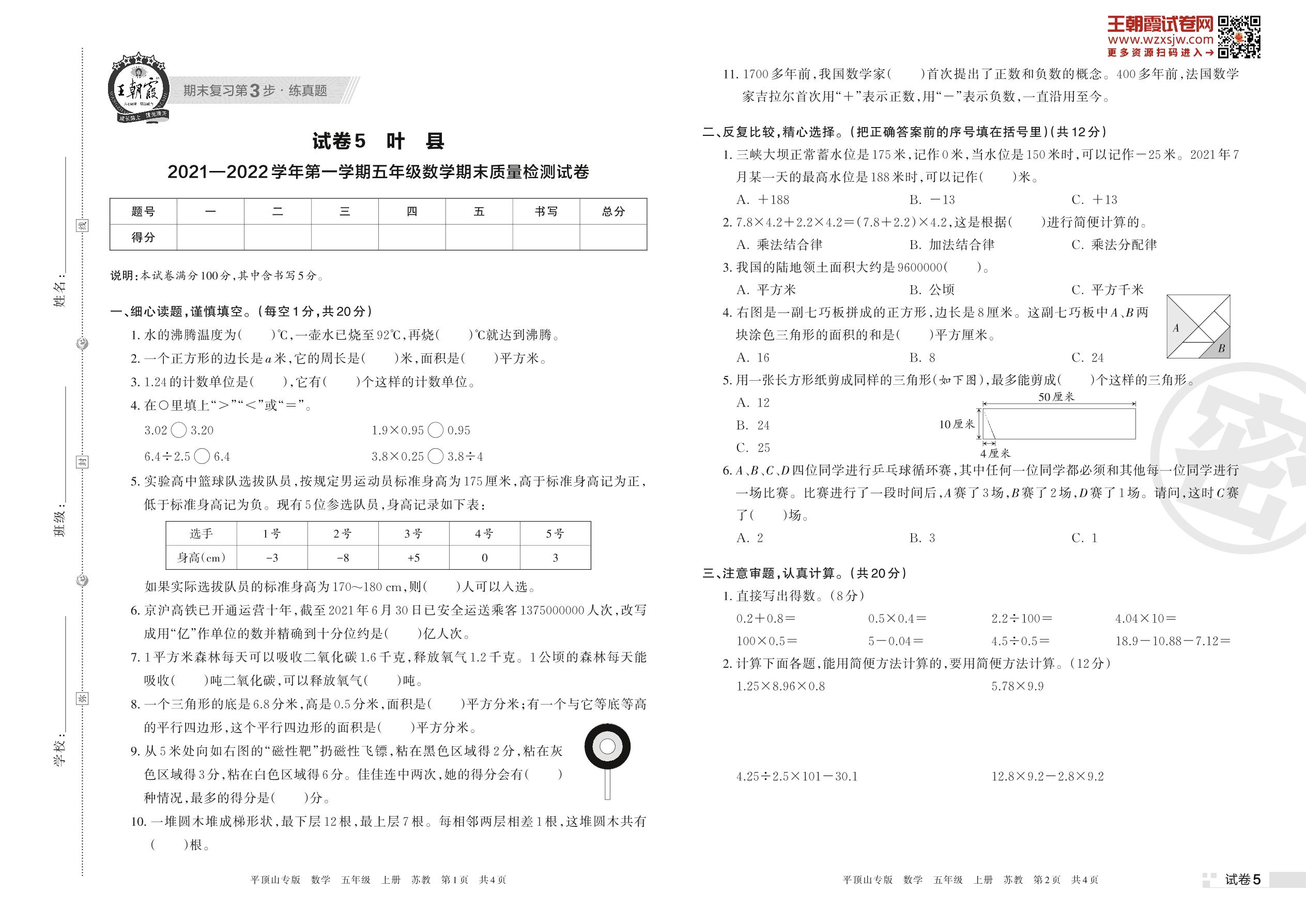 叶县2021—2022学年第一学期五年级数学期末质量检测试卷(苏教版)【5】