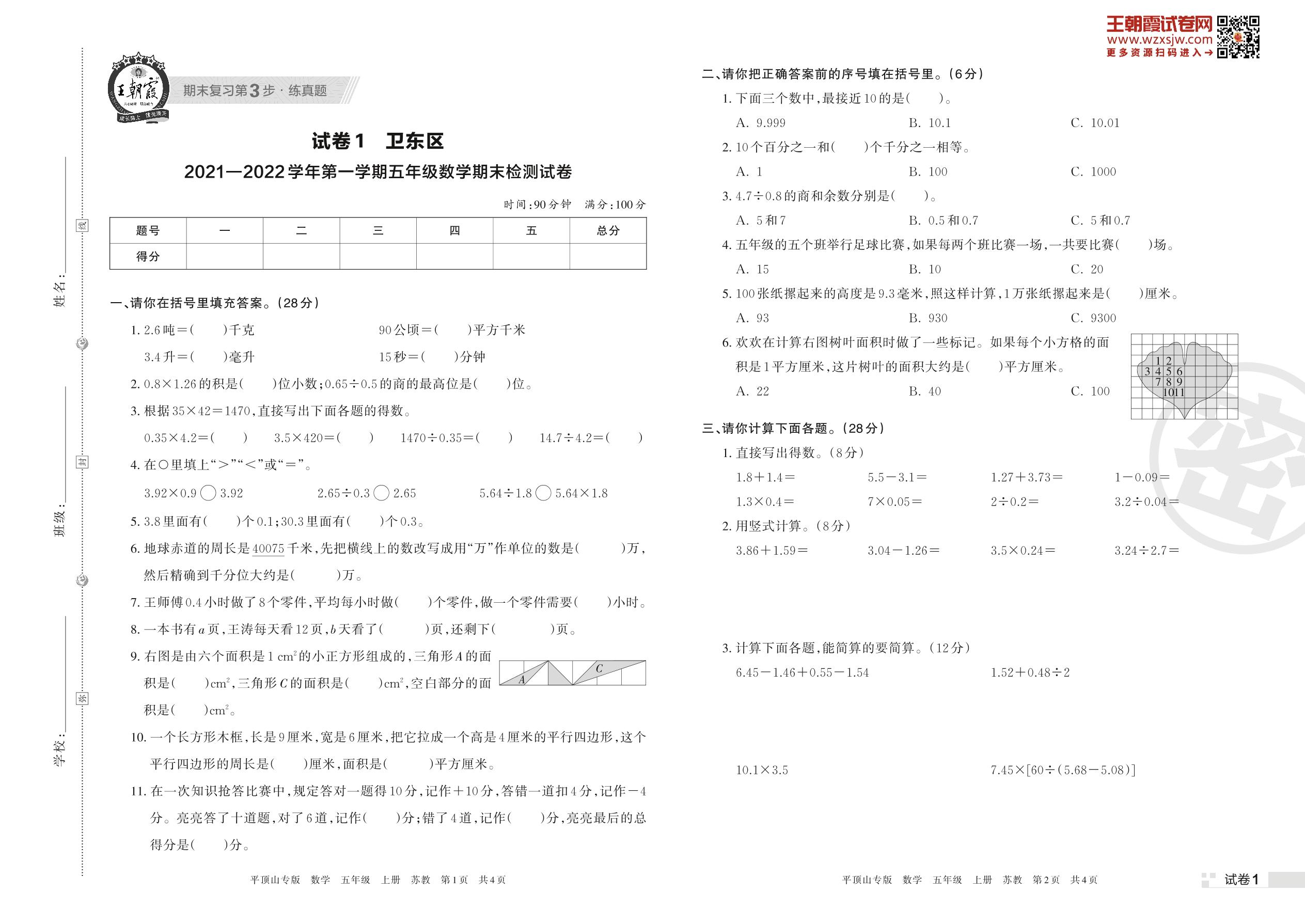 卫东区2021—2022学年第一学期五年级数学期末检测试卷(苏教版)【1】