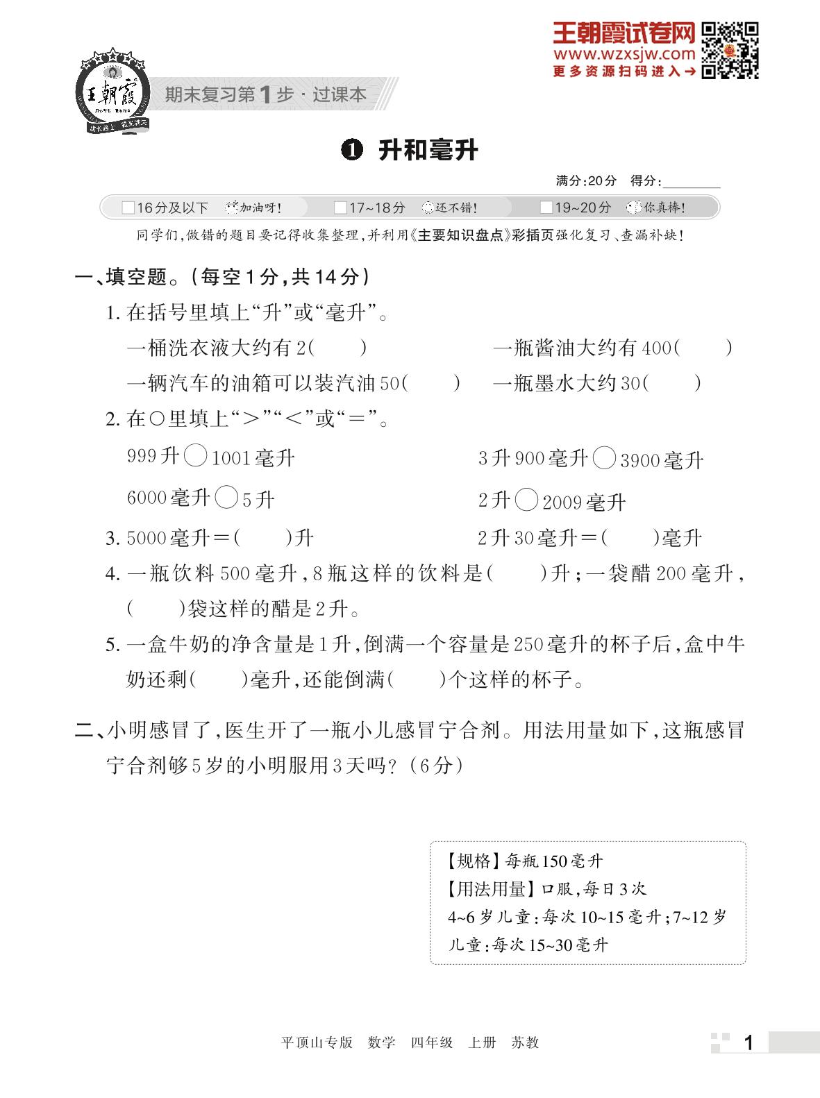 王朝霞期末过课本——1 升和毫升四年级上册数学(苏教版)_R221128142720672
