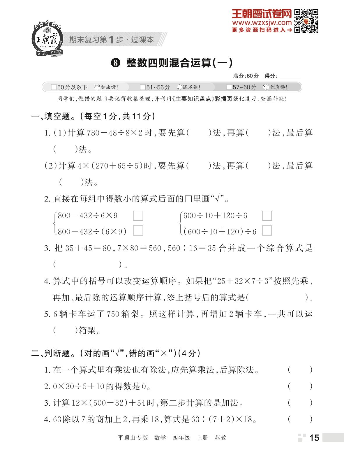 王朝霞期末过课本——8 整数四则混合运算(一)四年级上册数学(苏教版)_R221128142721840