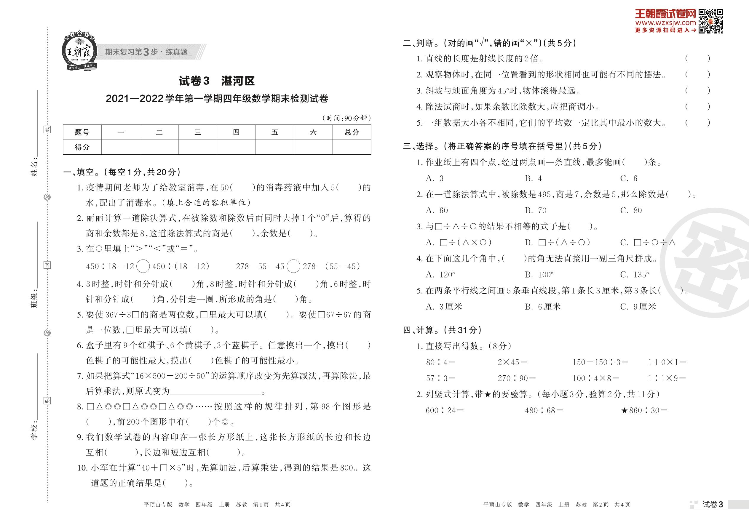 湛河区2021—2022学年第一学期四年级数学期末检测试卷(苏教版)【3】