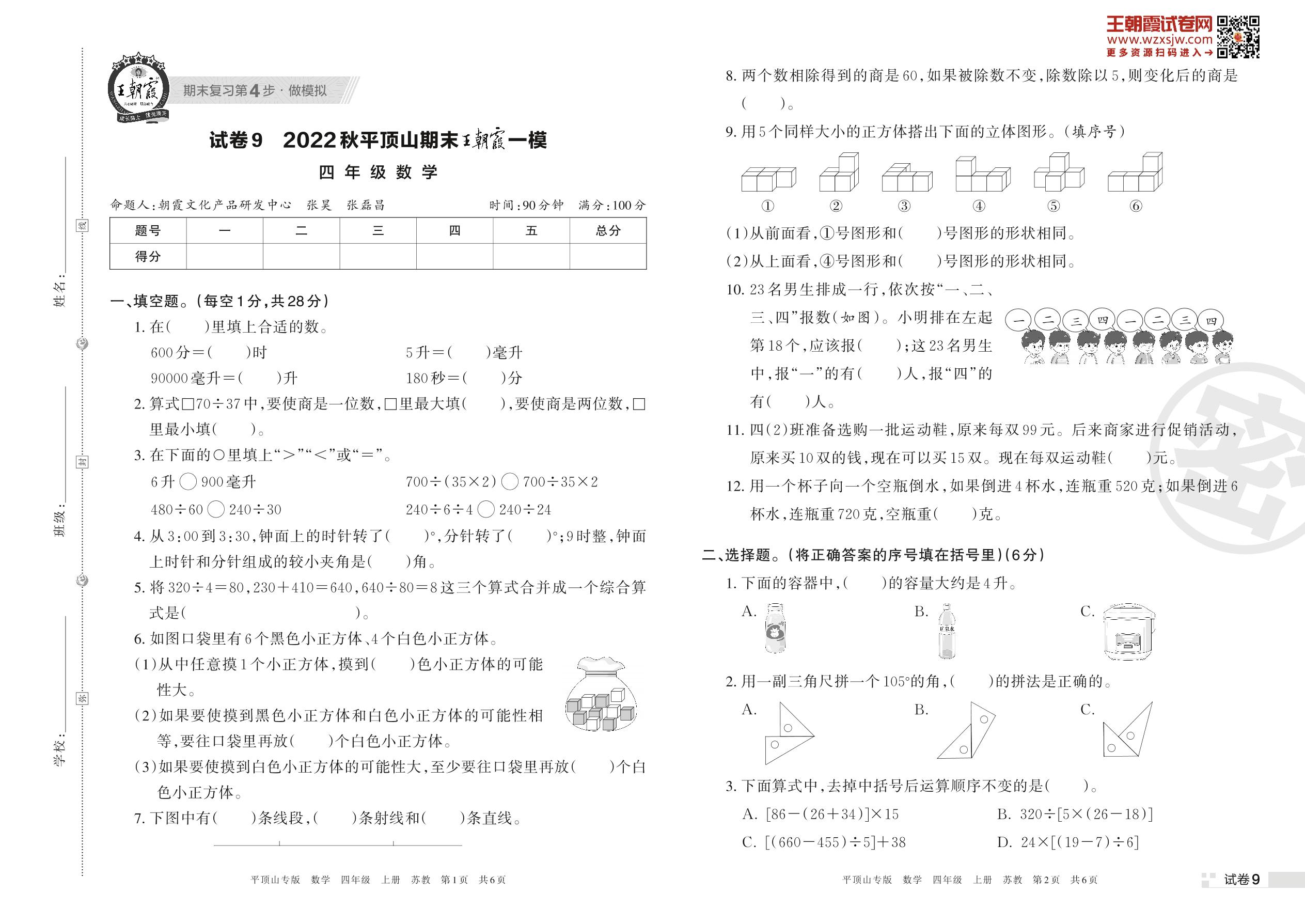 王朝霞期末模拟卷四年级上册数学(苏教版)_R221128142723011【9】