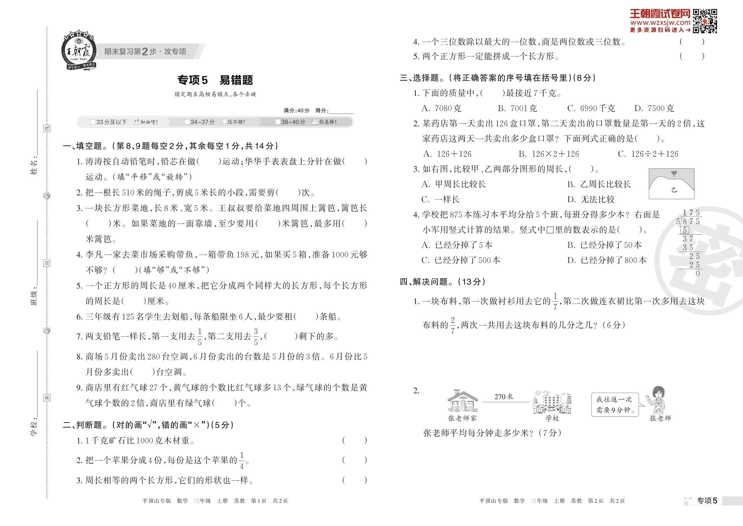 王朝霞期末专项卷——易错题三年级上册数学(苏教版)_R221128153509158【5】