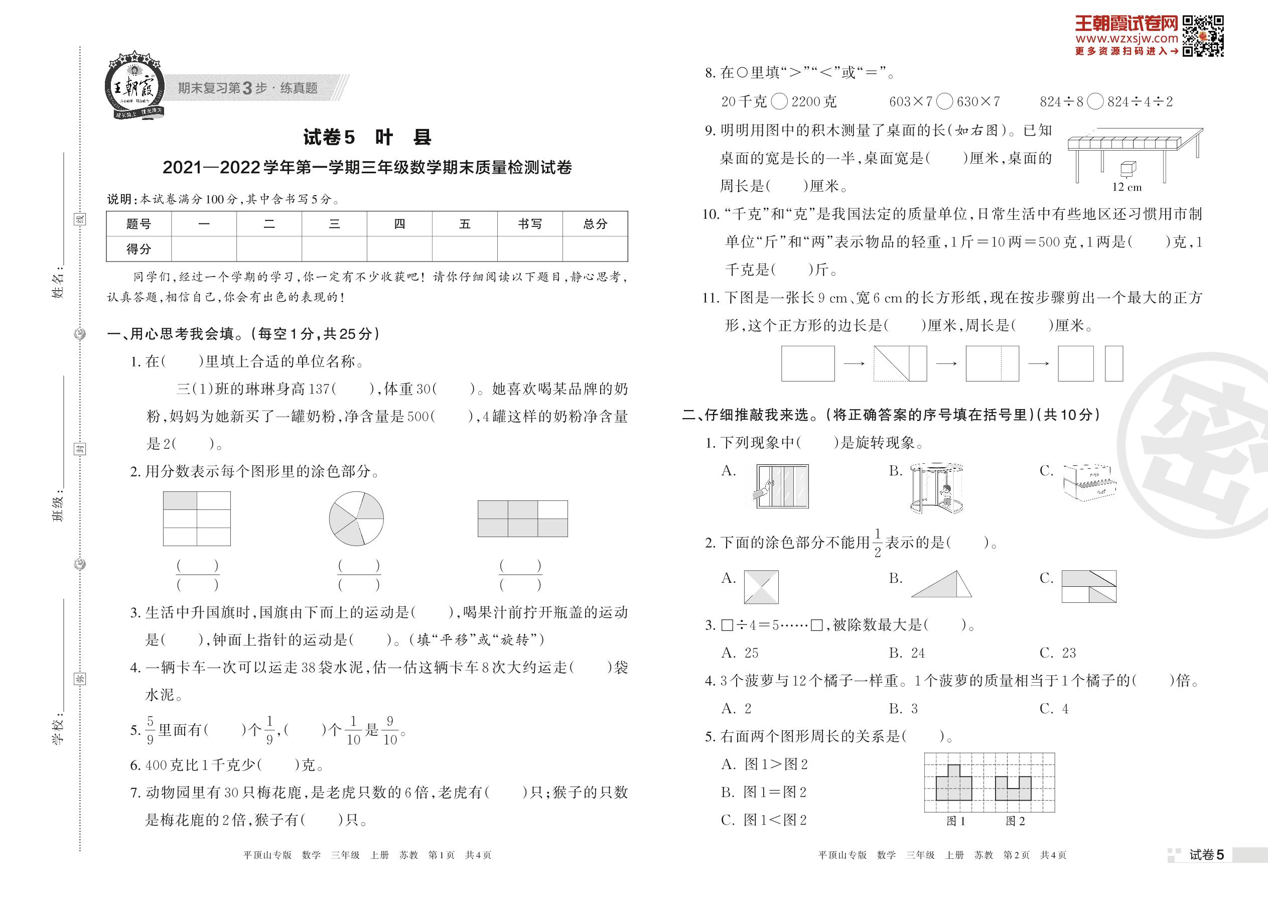 叶县2021—2022学年第一学期三年级数学期末质量检测试卷(苏教版)【5】