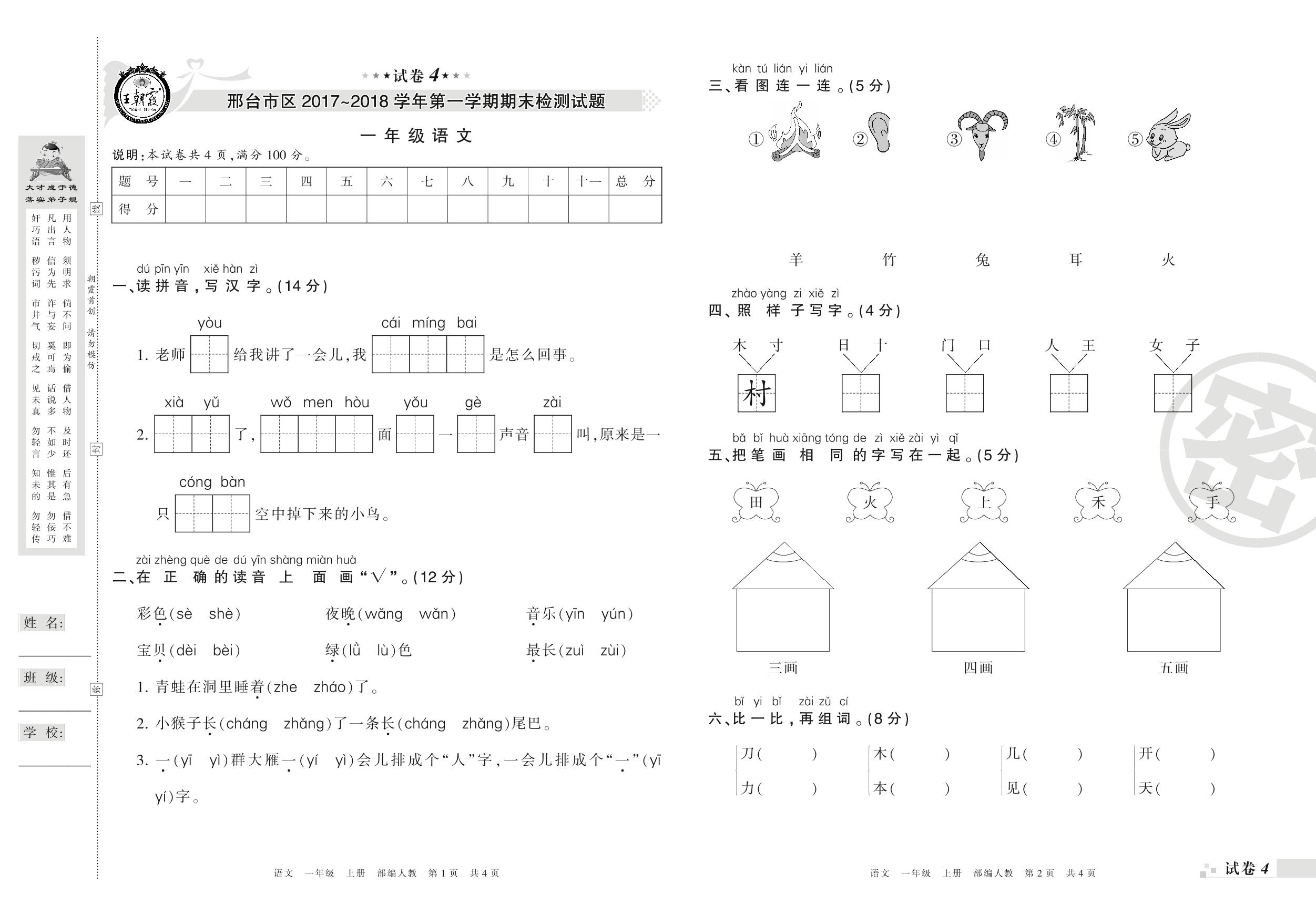 2017-2018学年第一学期邢台市区一年级语文试卷(人教版)【4】
