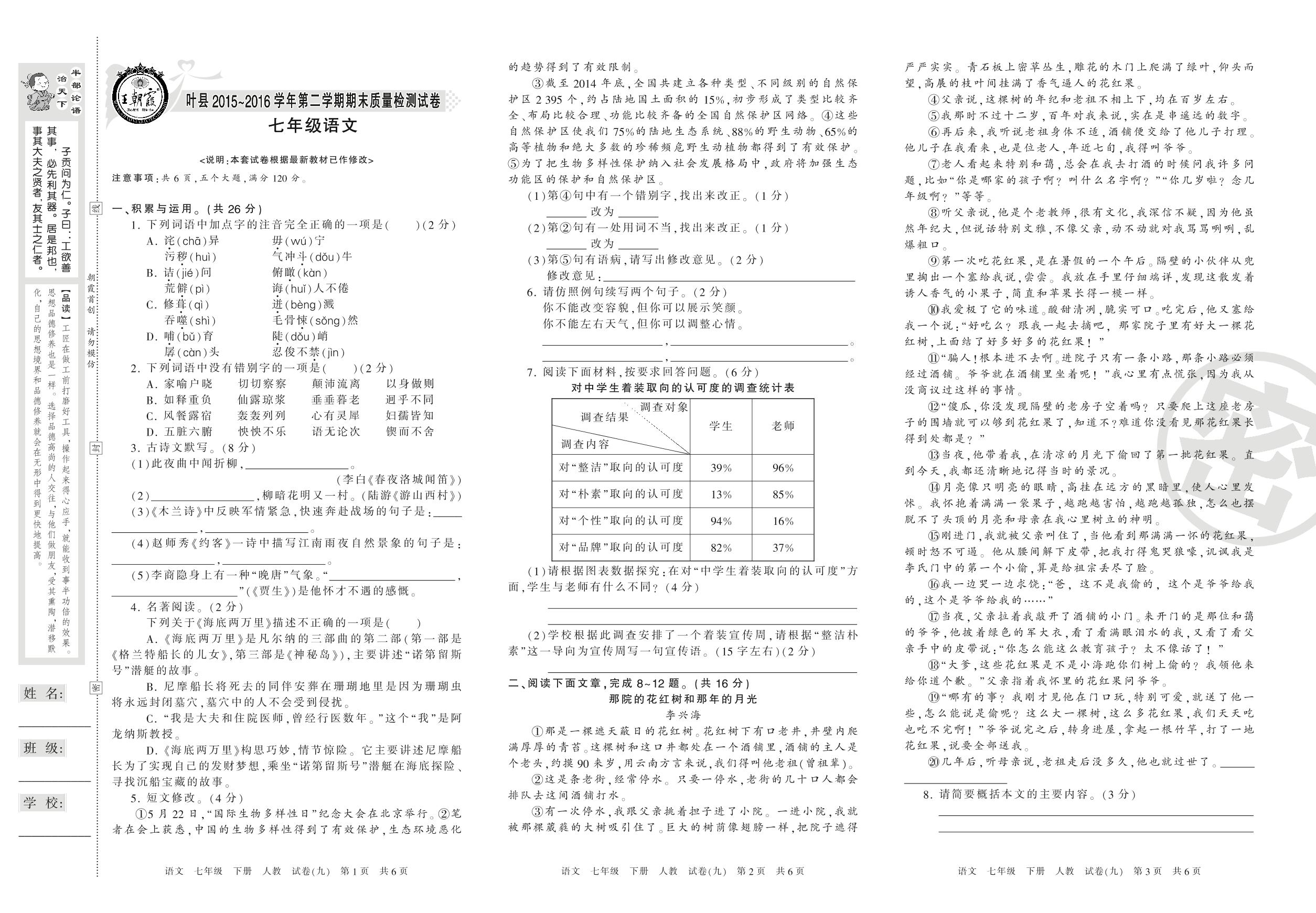 2015-2016学年第二学期平顶山市叶县七年级语文试卷(人教版)【9】