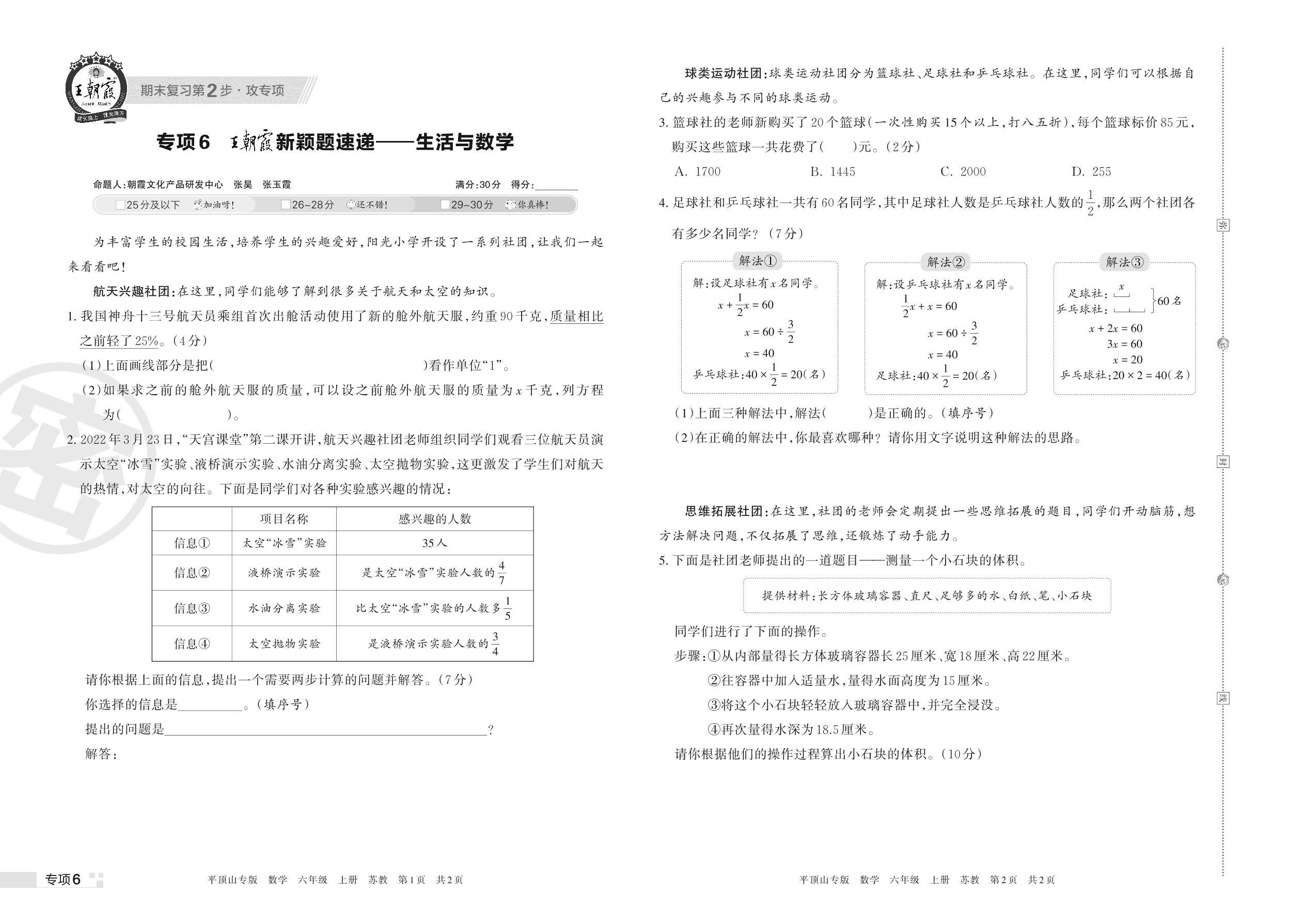 王朝霞期末专项卷——王朝霞新颖题速递:生活与数学六年级上册数学(苏教版)_R221128155416841【6】