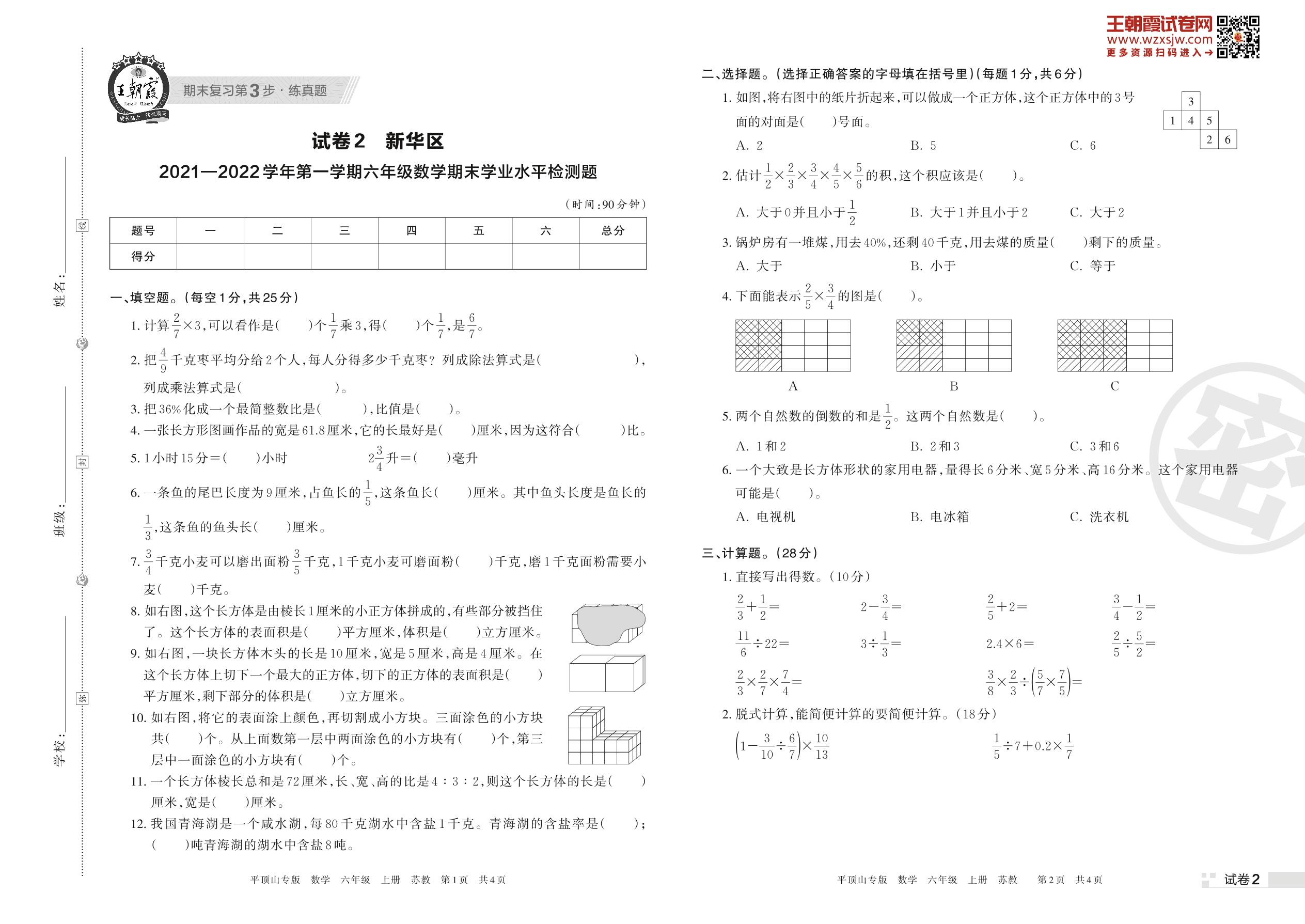 新华区2021—2022学年第一学期六年级数学期末学业水平检测题(苏教版)【2】