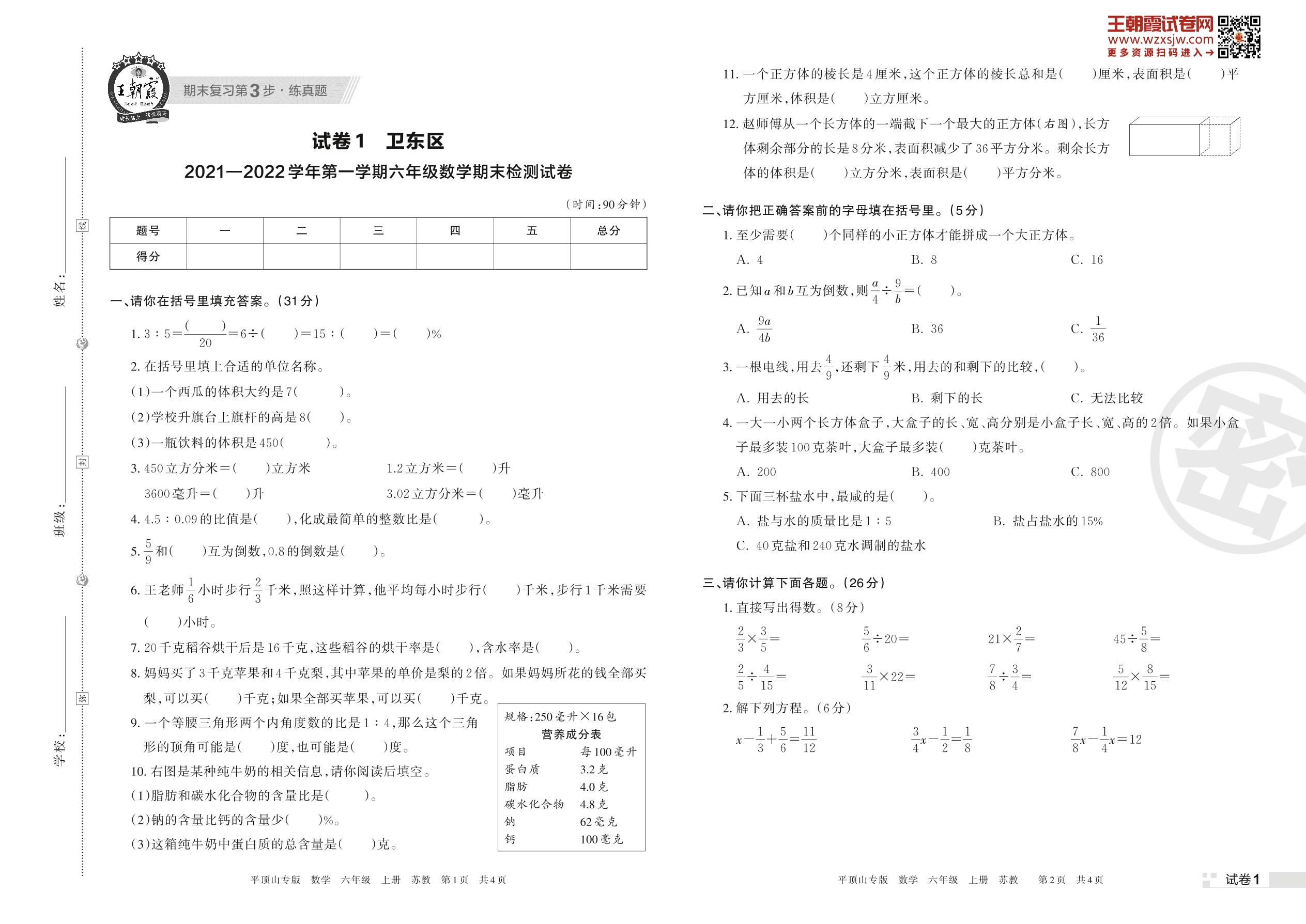 卫东区2021—2022学年第一学期六年级数学期末检测试卷(苏教版)【1】
