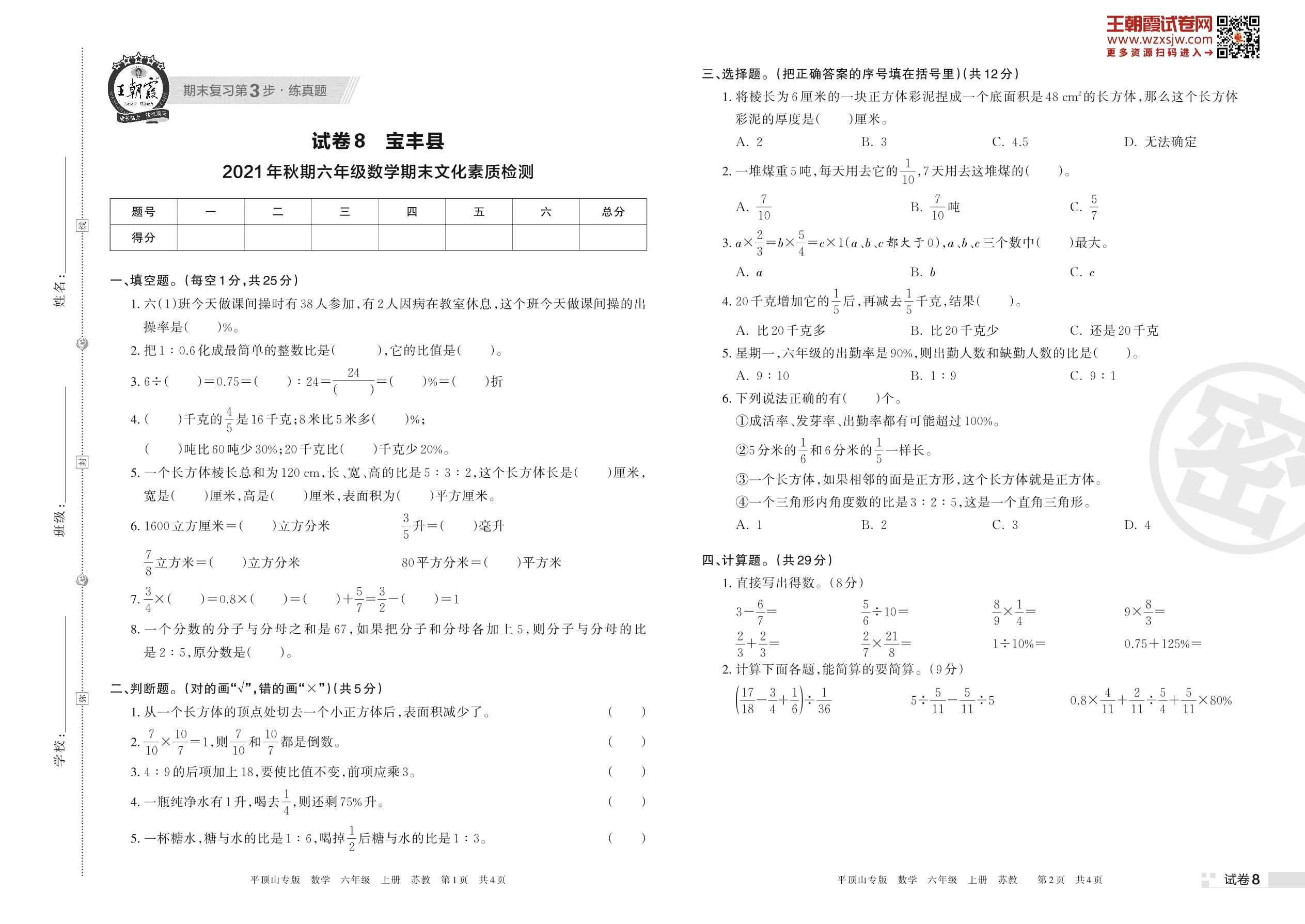 宝丰县2021年秋期六年级数学期末文化素质检测(苏教版)【8】