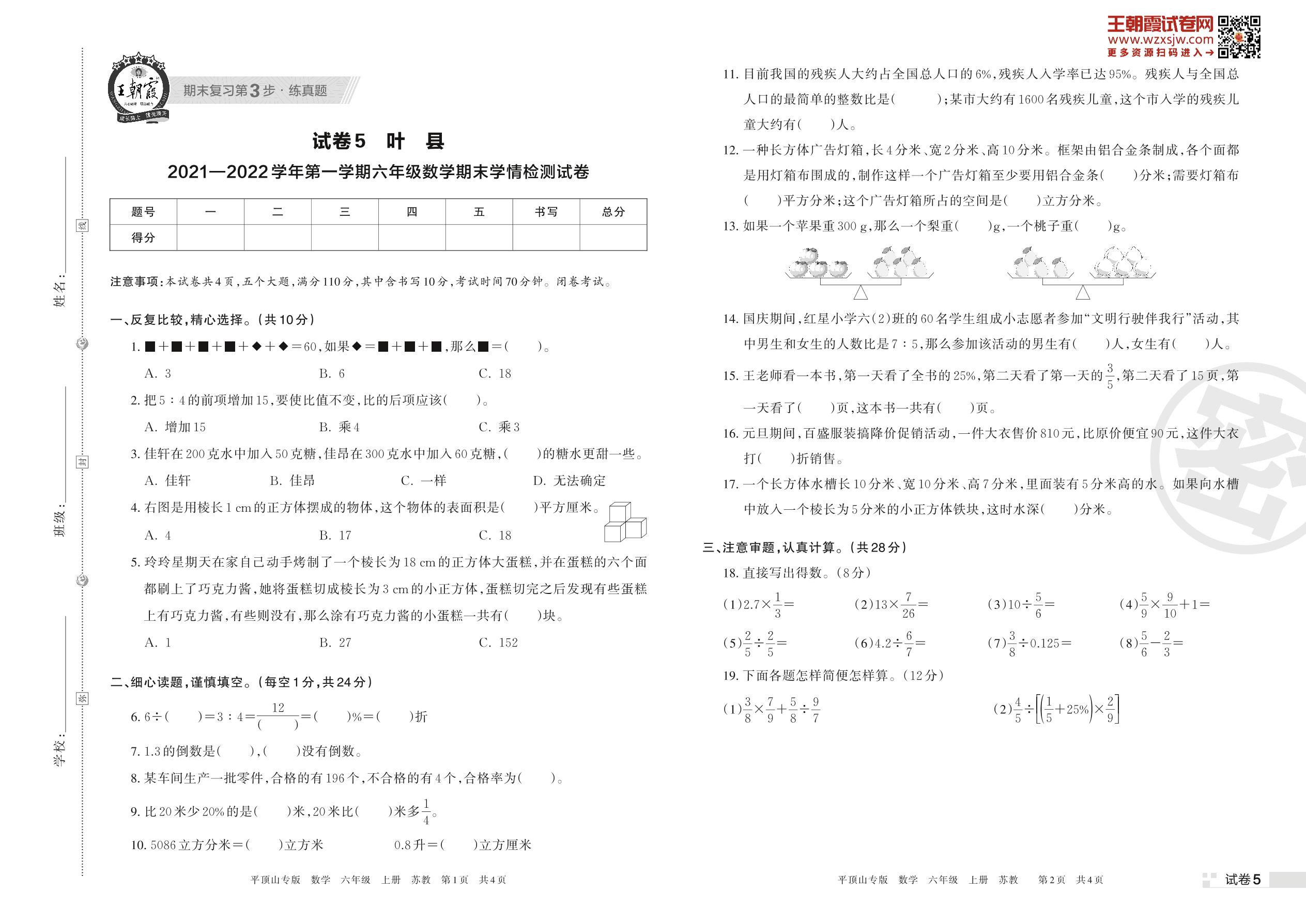 叶县2021—2022学年第一学期六年级数学期末学情检测试卷(苏教版)【5】