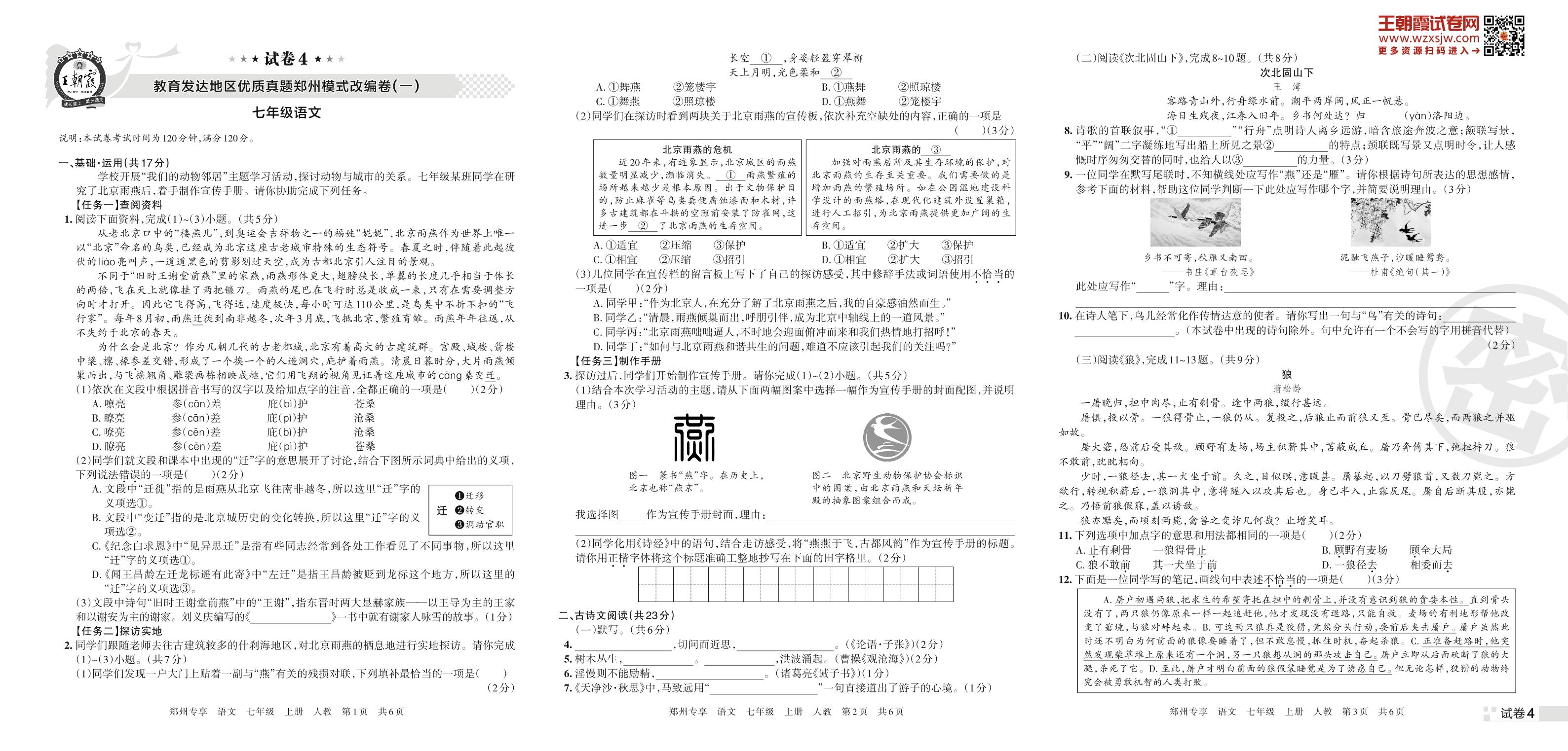 教育发达地区优质真题郑州模式改编卷(一)七年级上册语文(人教版)【4】