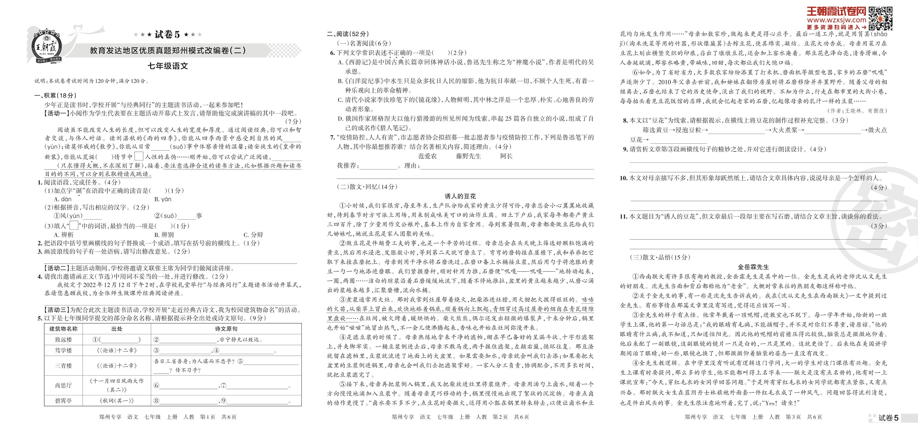 教育发达地区优质真题郑州模式改编卷(二)七年级上册语文(人教版)【5】