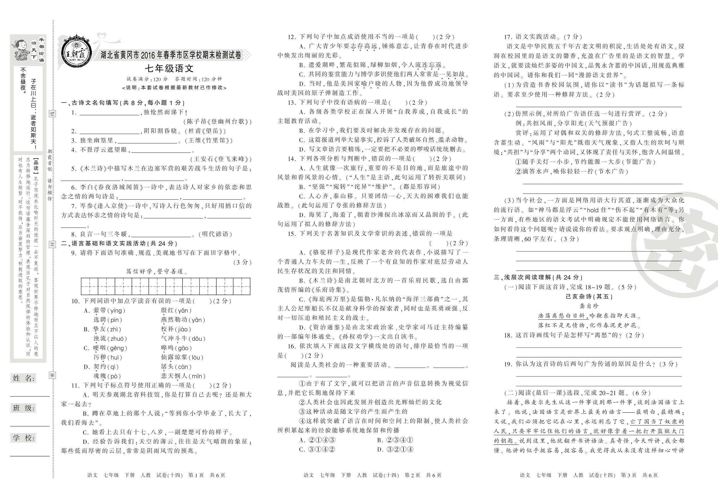 2015-2016学年第二学期湖北省黄冈市七年级语文试卷(人教版)【14】