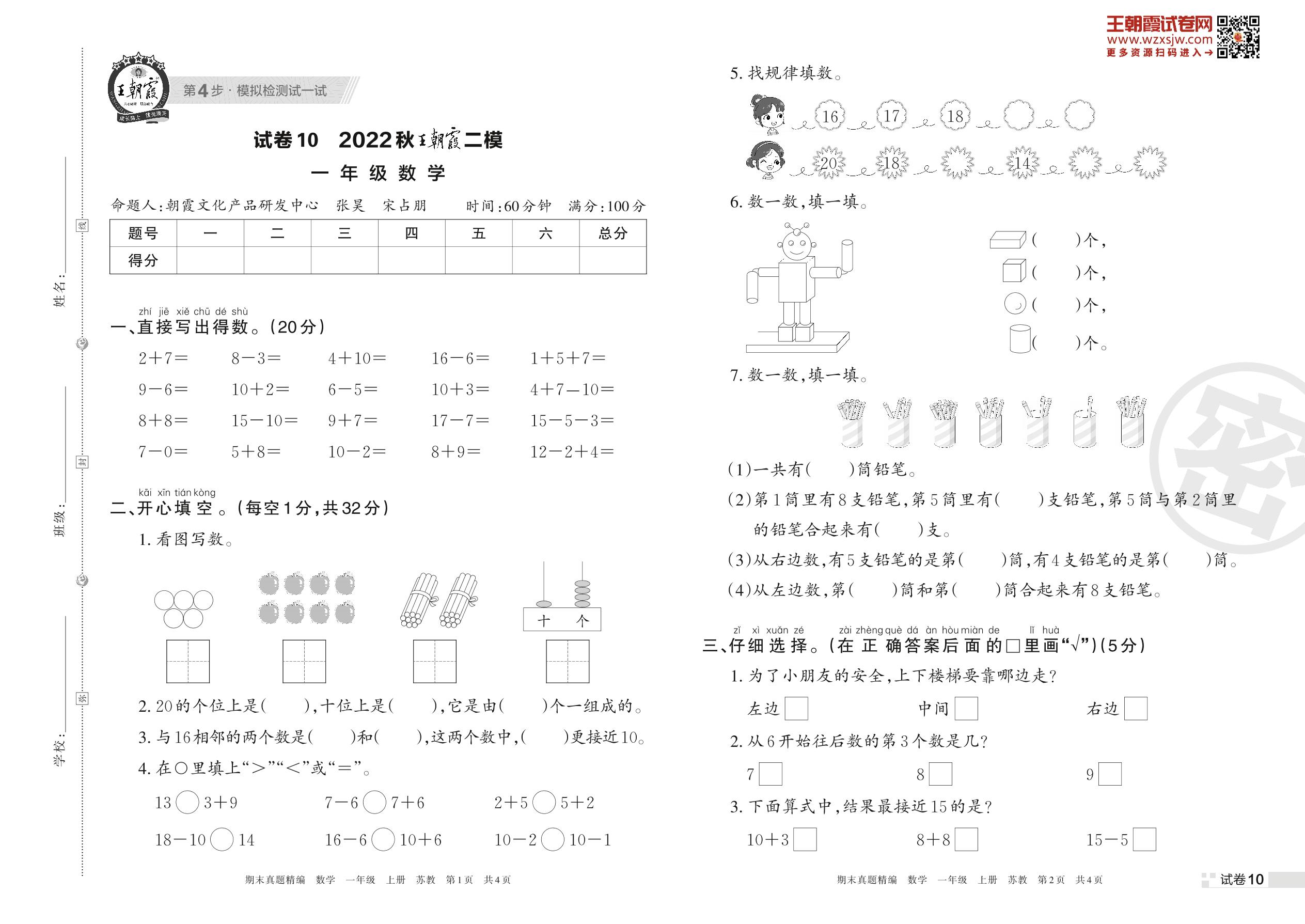 王朝霞期末模拟卷一年级上册数学(苏教版)_R221128163155344【10】
