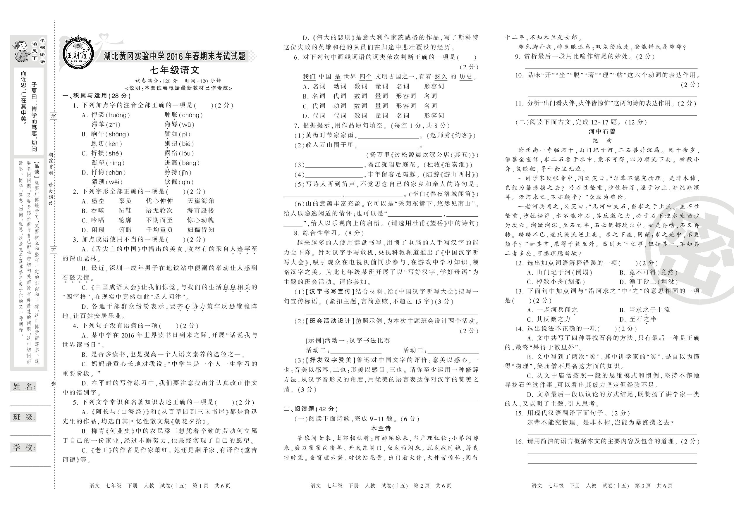 湖北黄冈实验中学七年级下册语文(人教版)【15】