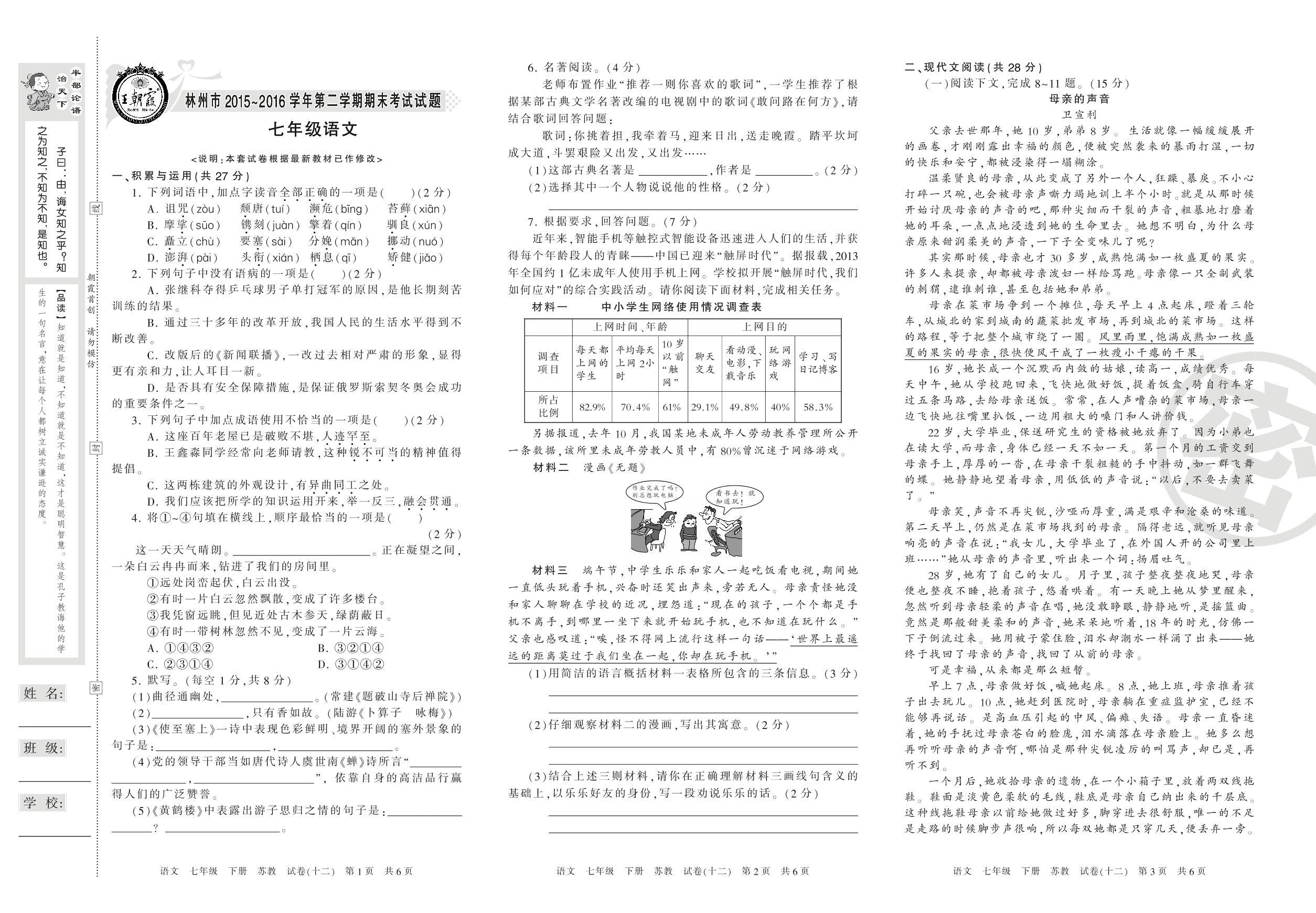 2015-2016学年第二学期林州市七年级语文试卷(苏教版)【12】