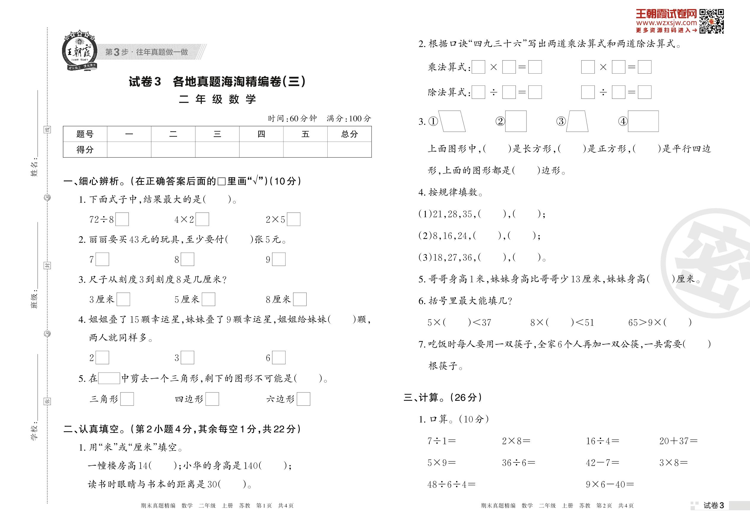 二年级数学苏教版上册期末卷