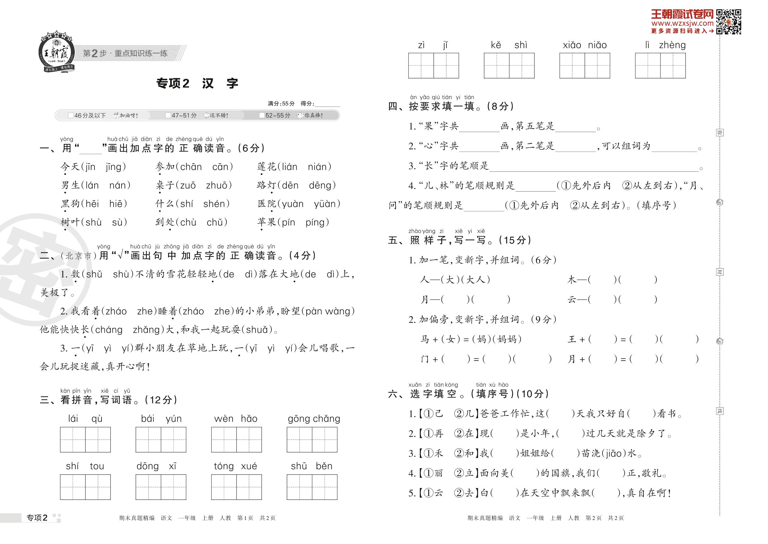 王朝霞期末专项卷——汉字一年级上册语文(人教版)_R221128164654936【2】