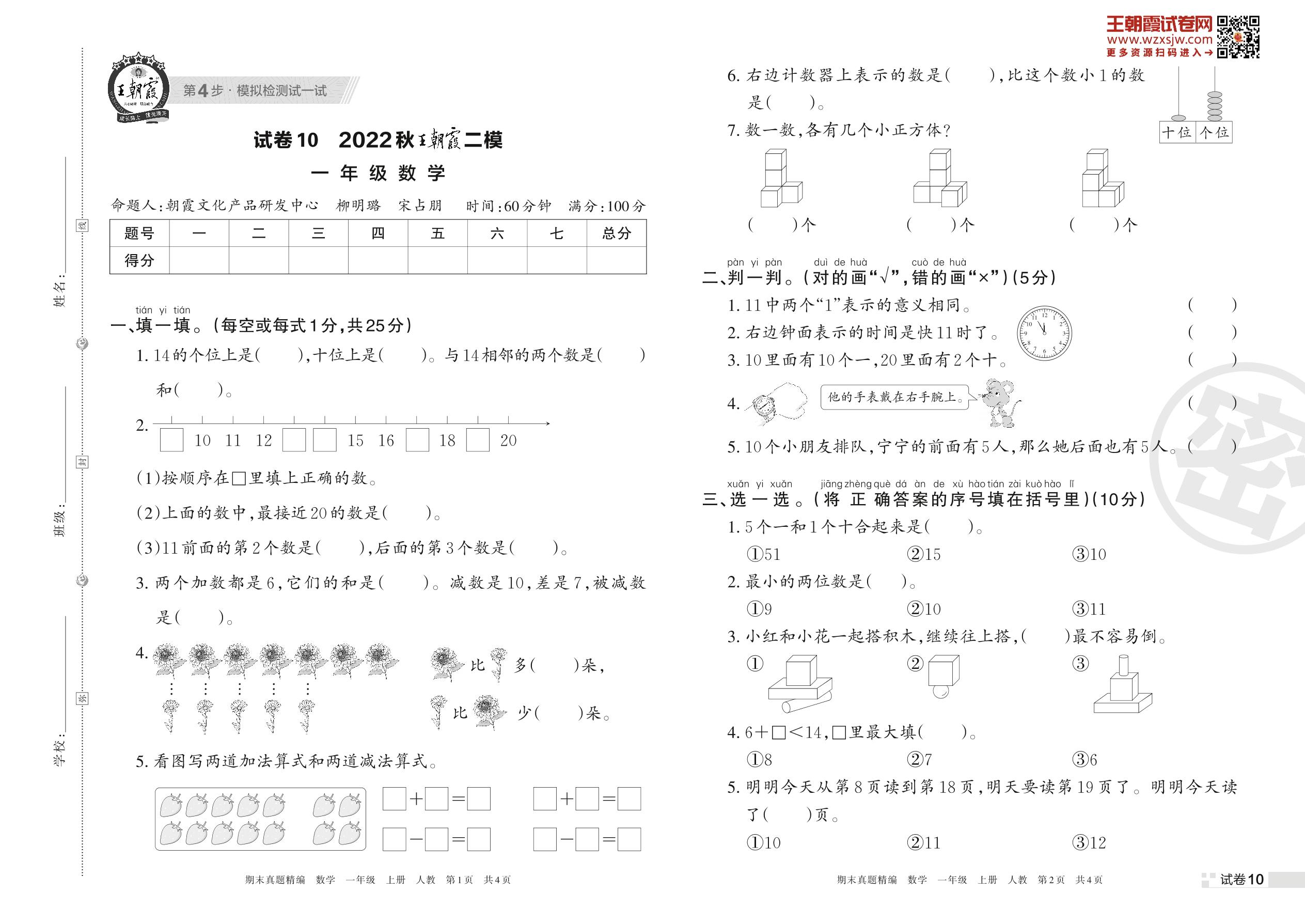 王朝霞期末模拟卷一年级上册数学(人教版)_R221128170329743【10】