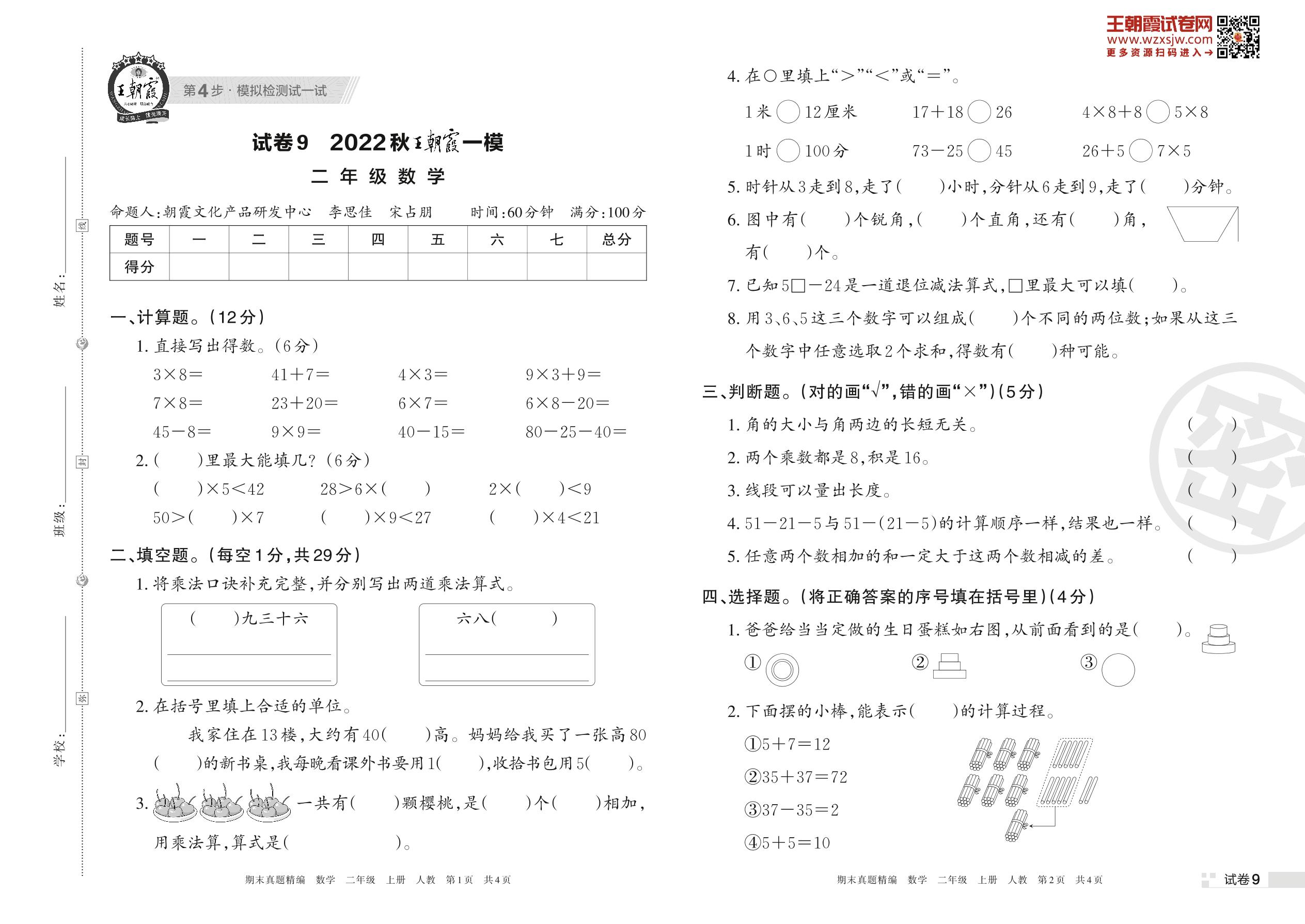 王朝霞期末模拟卷二年级上册数学(人教版)_R221128175218173【9】