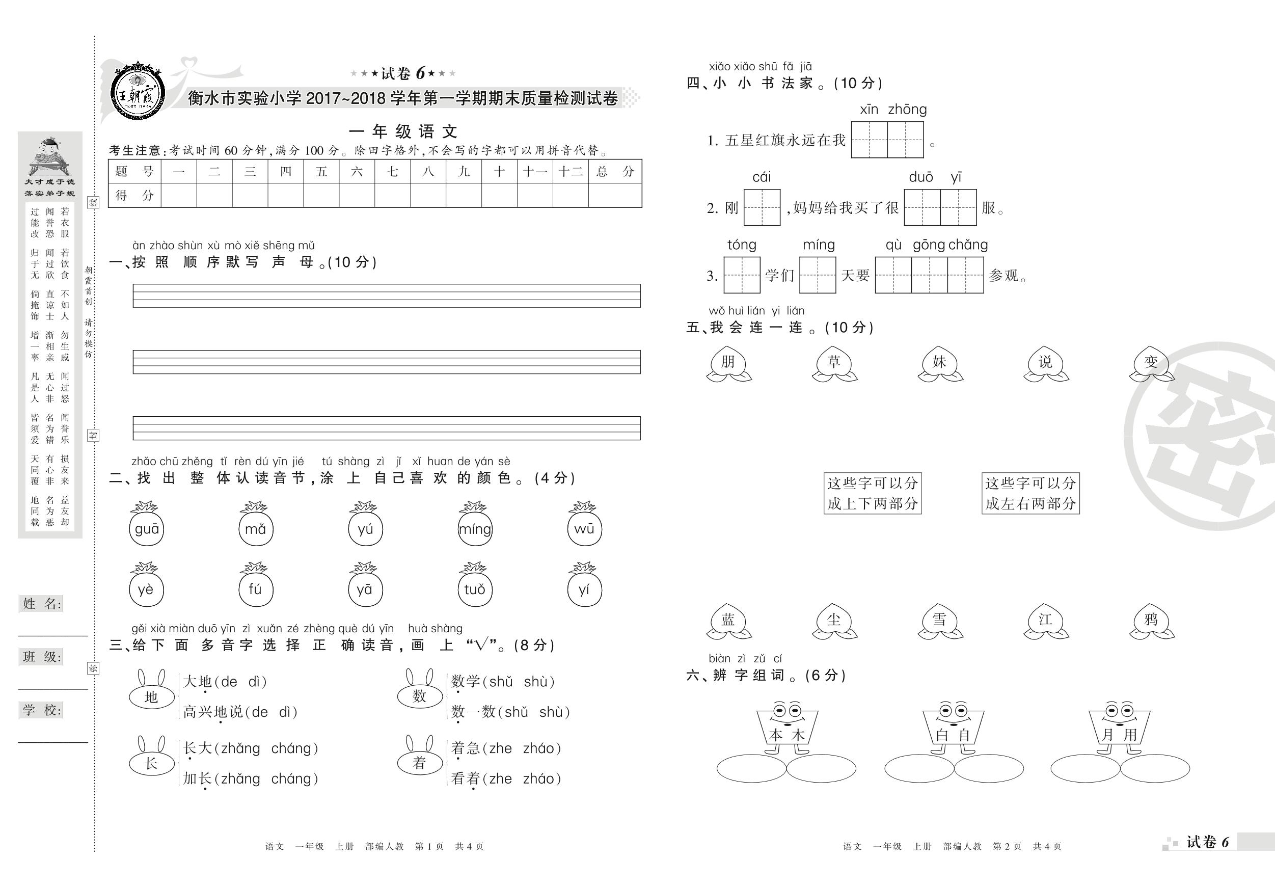 2017-2018学年第一学期衡水市实验小学一年级语文试卷(人教版)【6】
