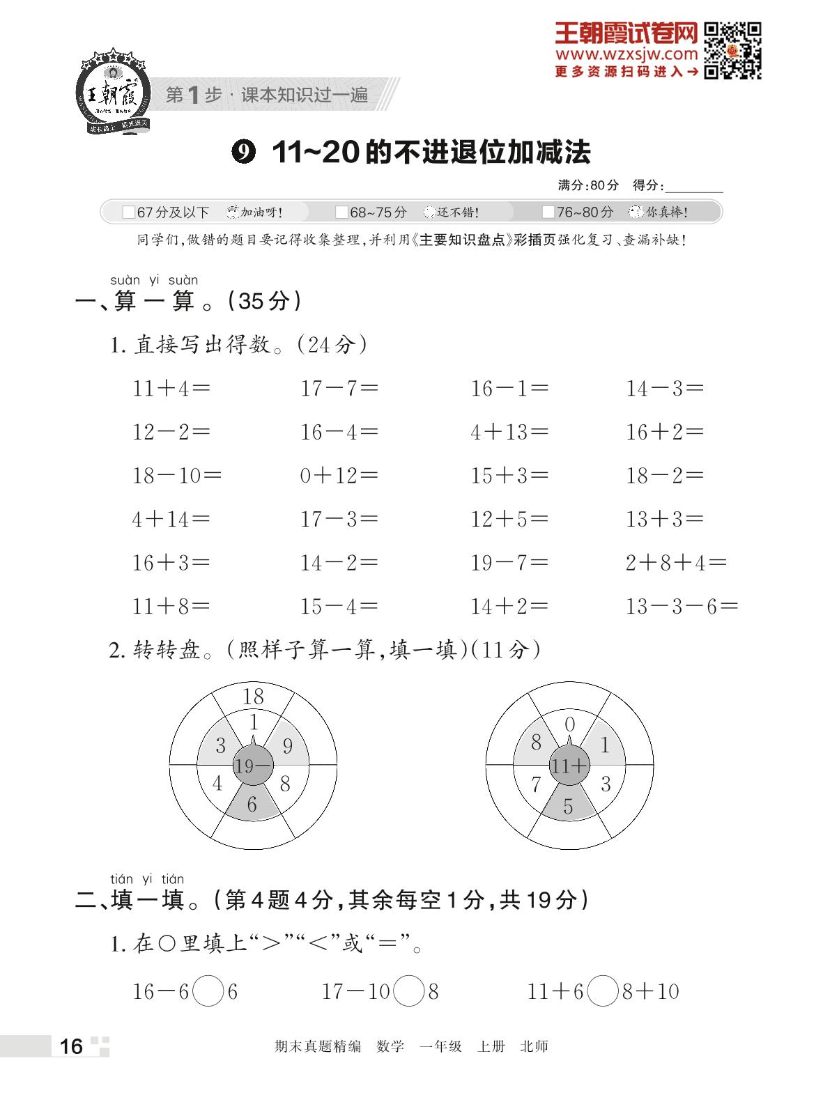 王朝霞期末过课本——9 11~20的不进退位加减法一年级上册数学(北师版)_R221128181102845