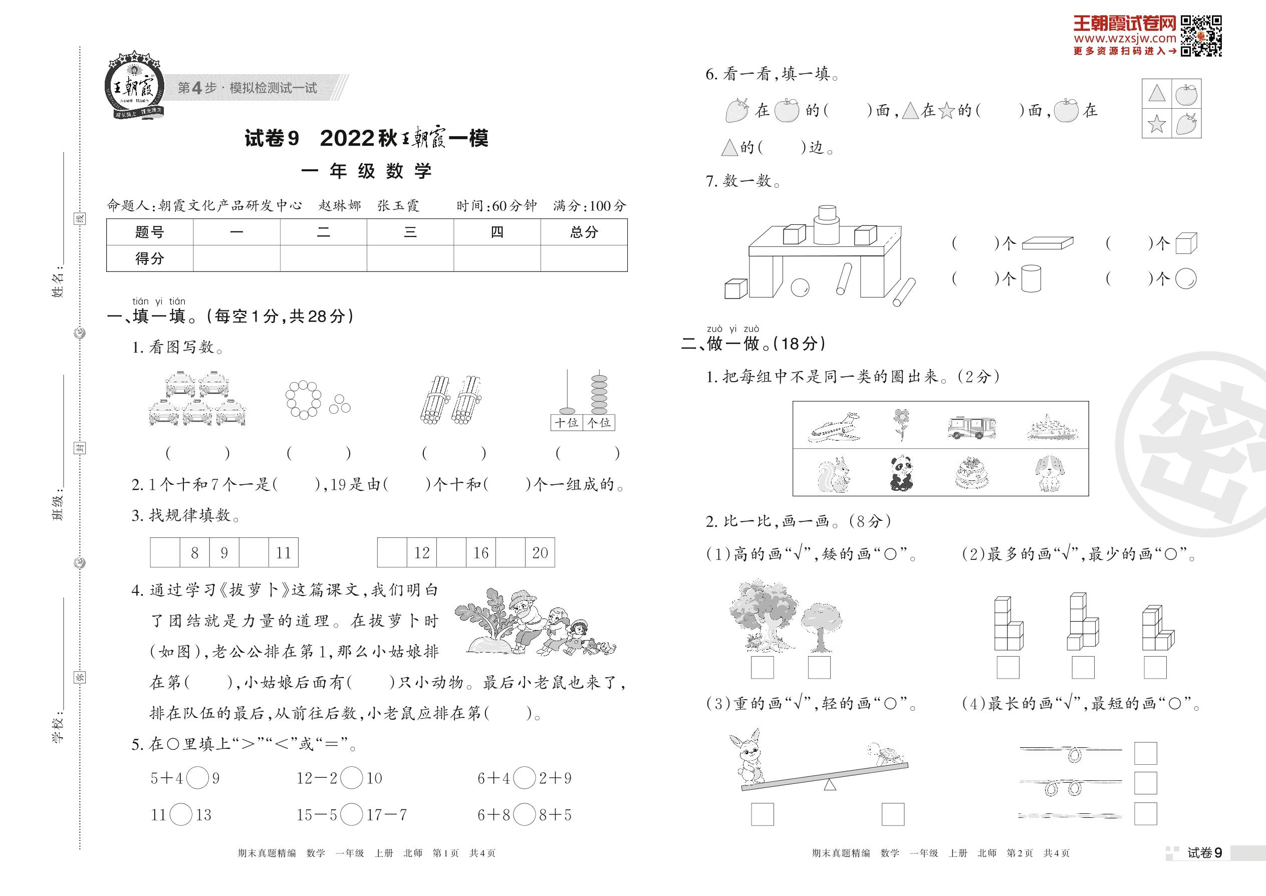 王朝霞期末模拟卷一年级上册数学(北师版)_R221128181104937【9】