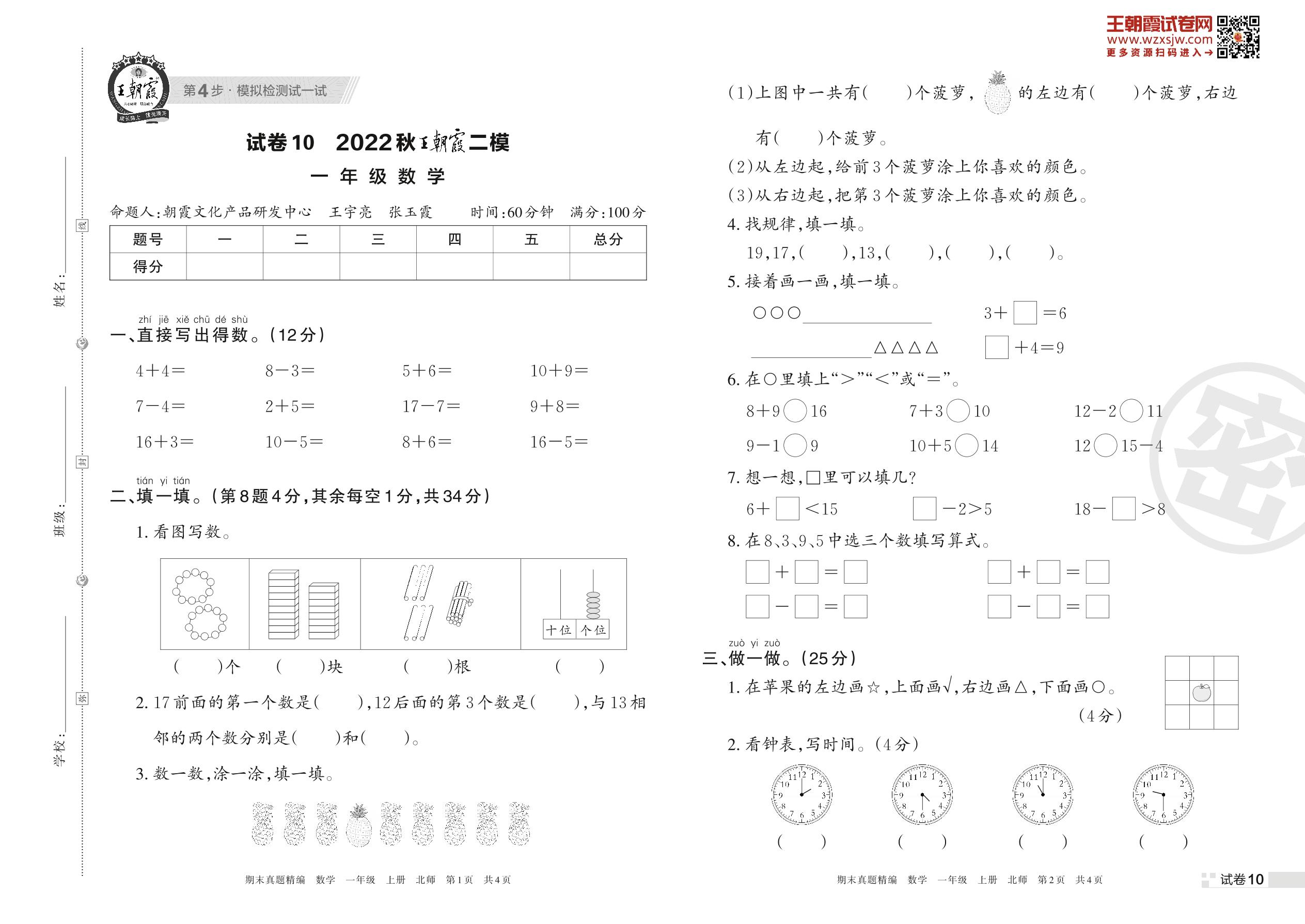 王朝霞期末模拟卷一年级上册数学(北师版)_R221128181104497【10】