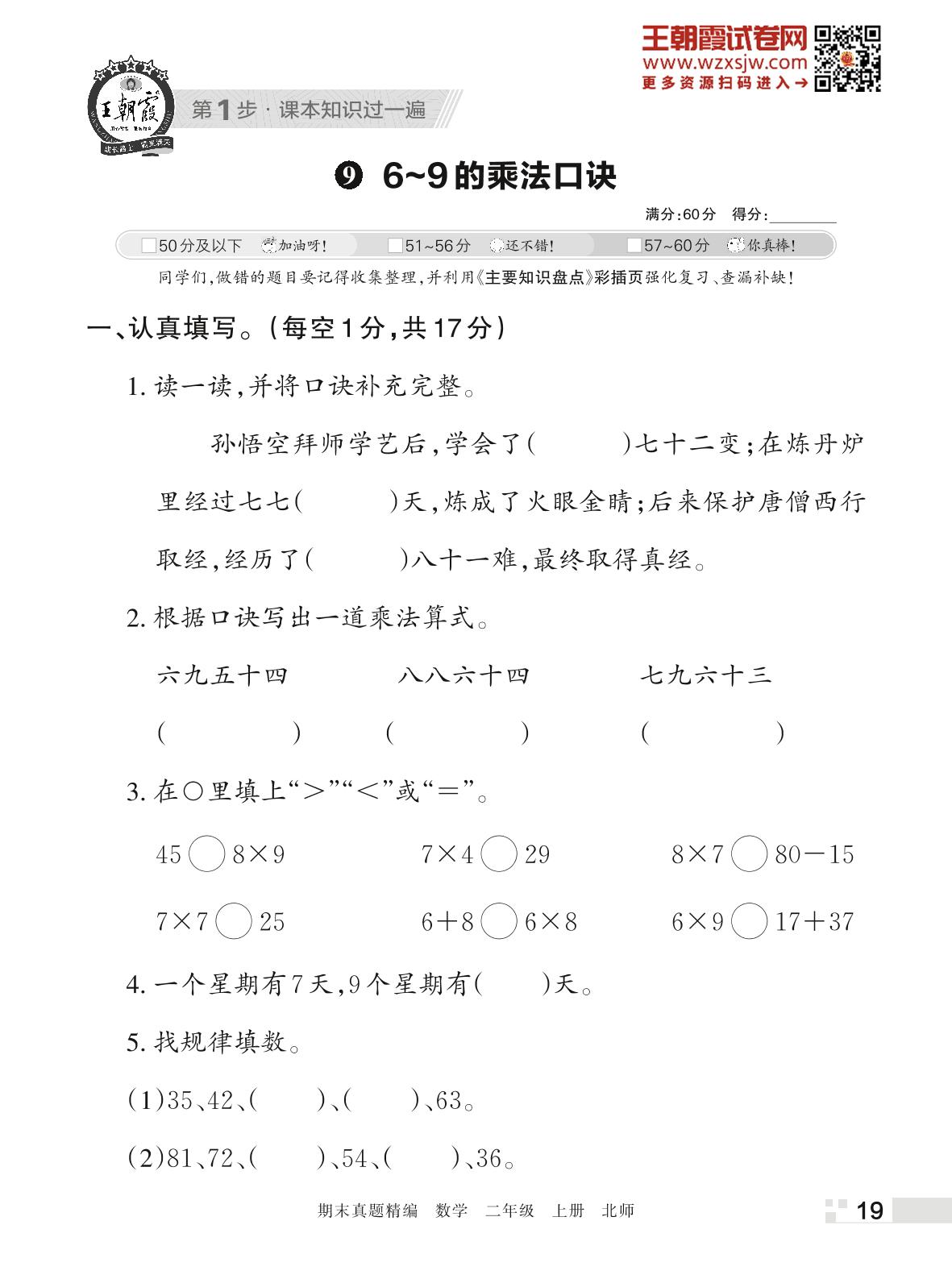 王朝霞期末过课本——9 6~9的乘法口诀二年级上册数学(北师版)_R221128183438722