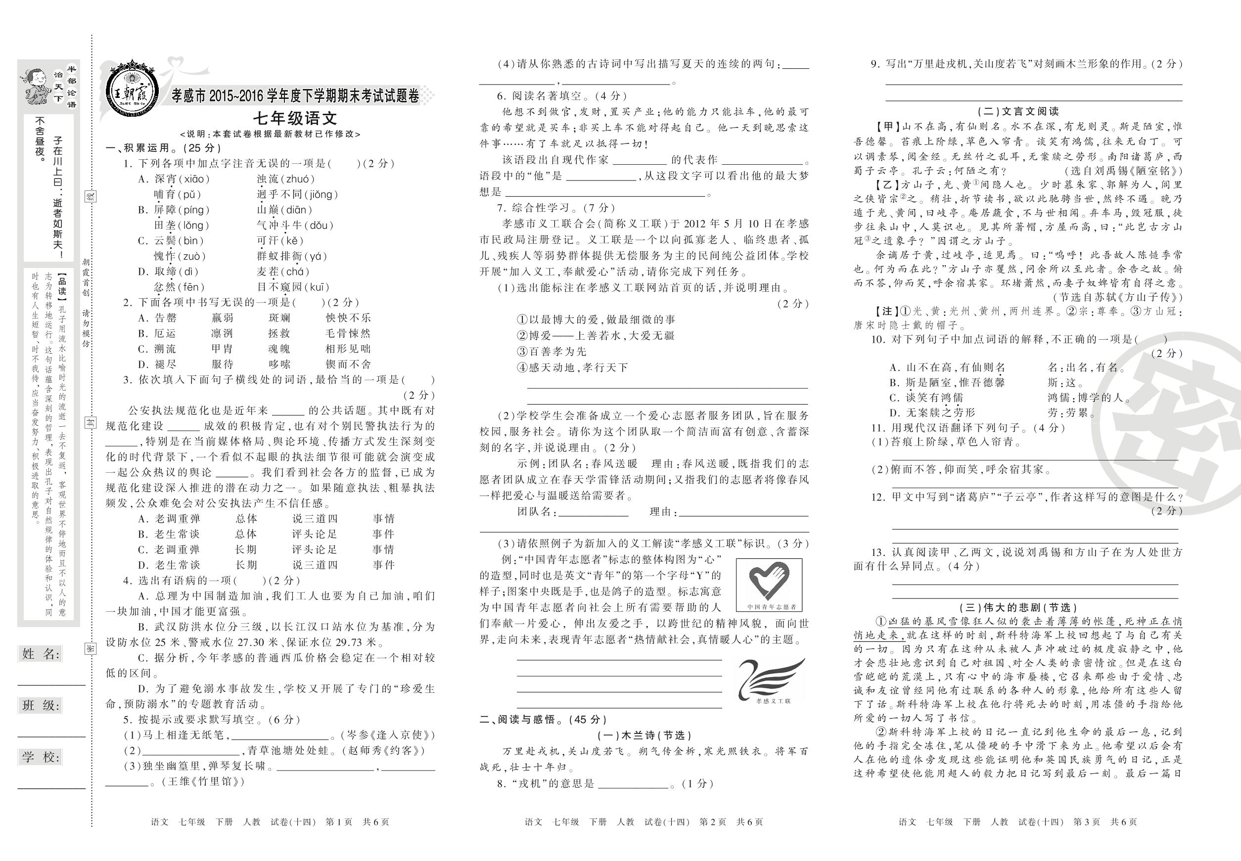 2015-2016学年第二学期孝感市七年级语文试卷(人教版)【14】