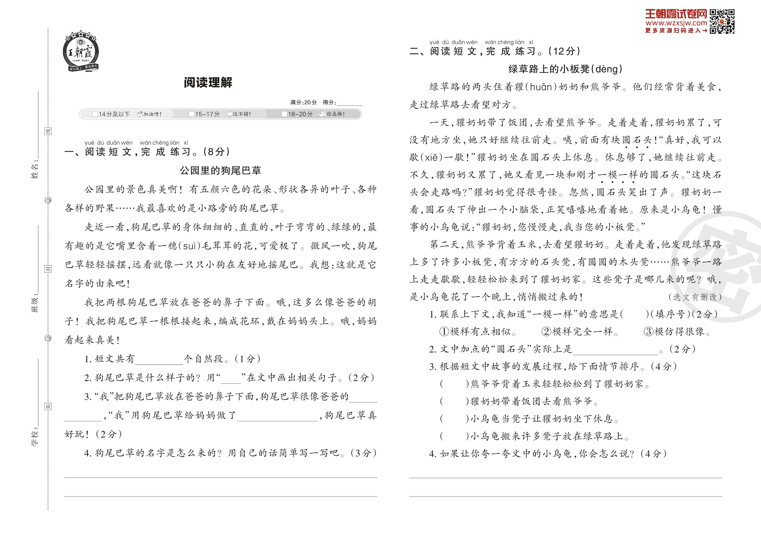 【易考突破】人教版·二年级上册·语文阅读理解(三)专项训练