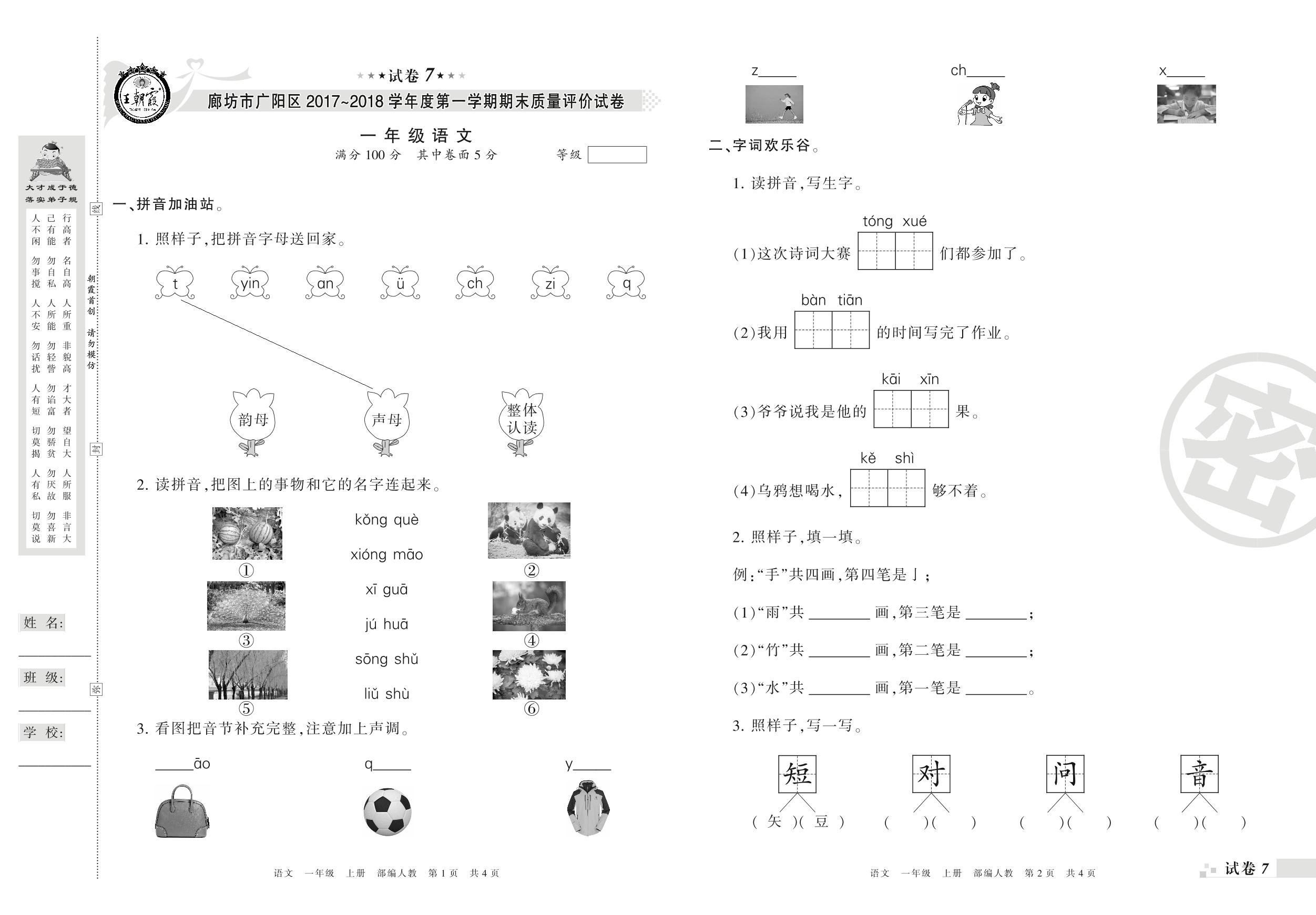 2017-2018学年第一学期廊坊市广阳区一年级语文试卷(人教版)【7】