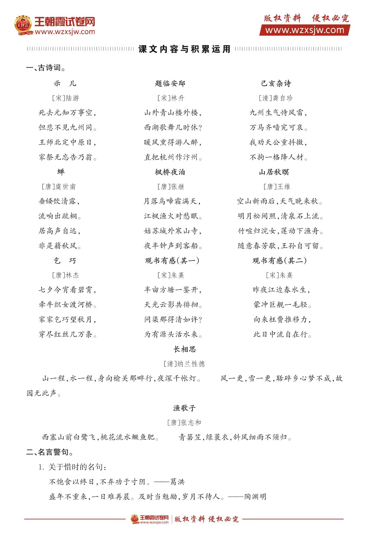 人教版·五年级上册·语文1~8单元必背课文、日积月累梳理