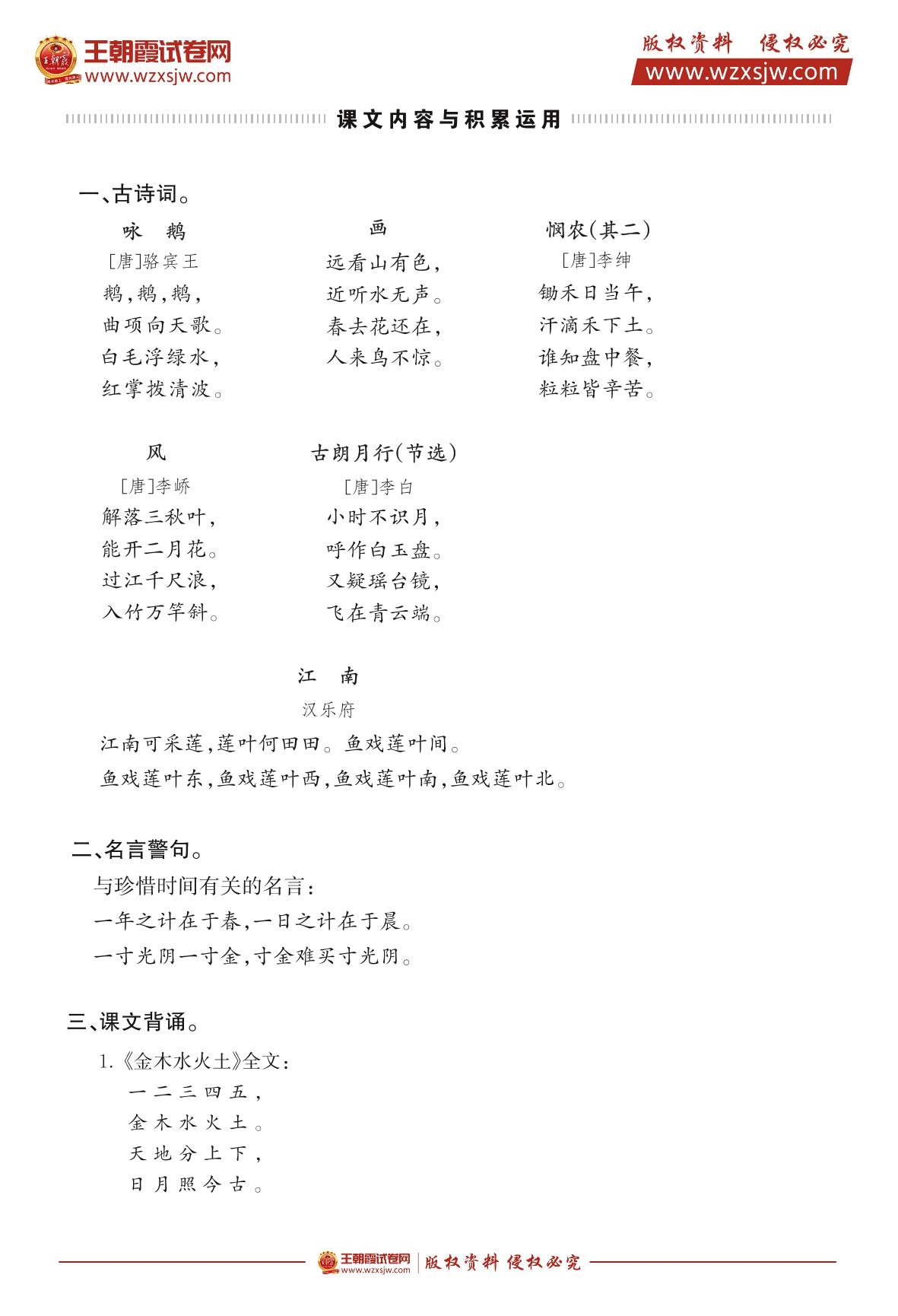 人教版·一年级上册·语文1~8单元必背课文、日积月累梳理
