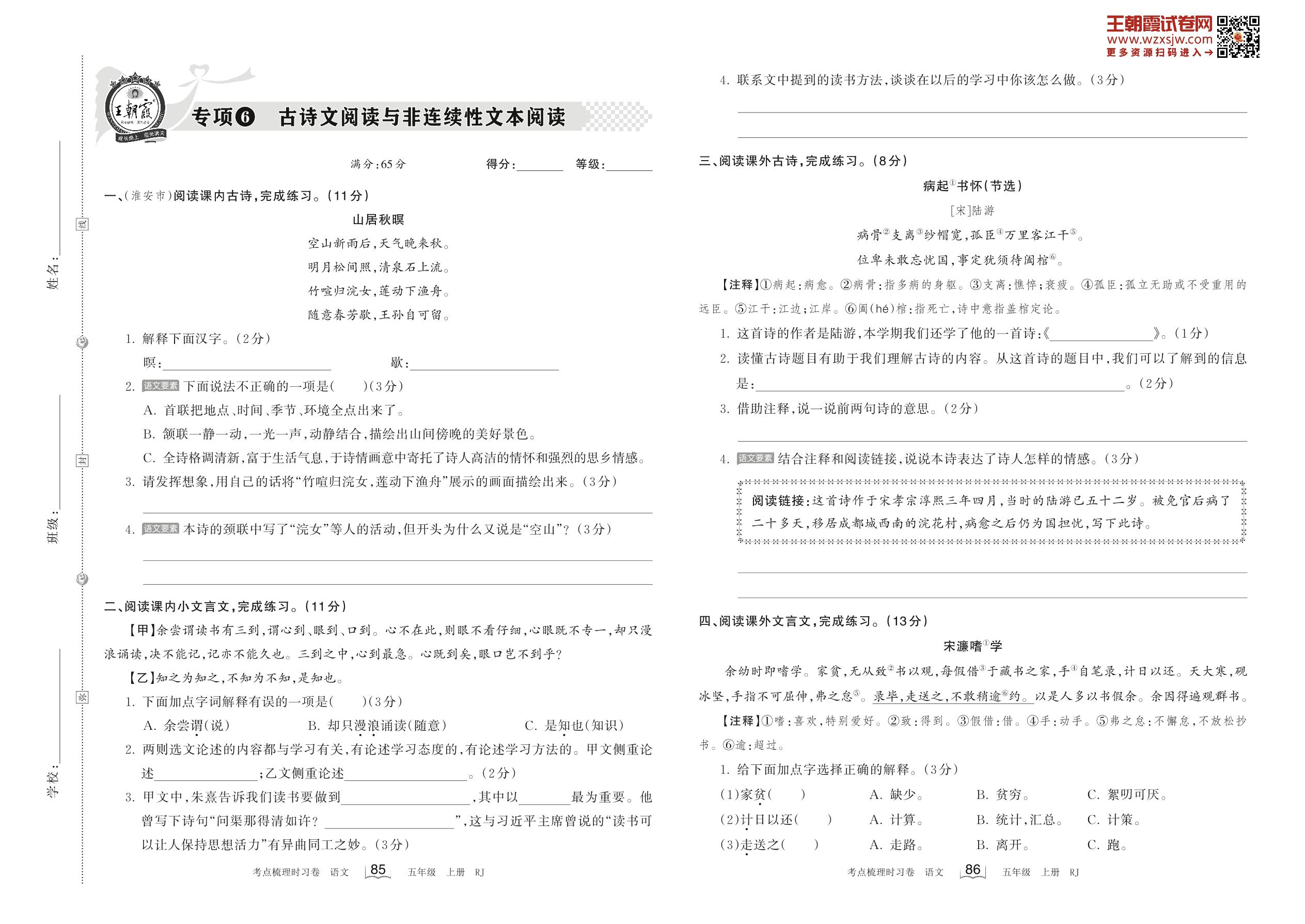 【易考突破】人教版·五年级上册·语文古诗文阅读与非连续性文本阅读专项训练