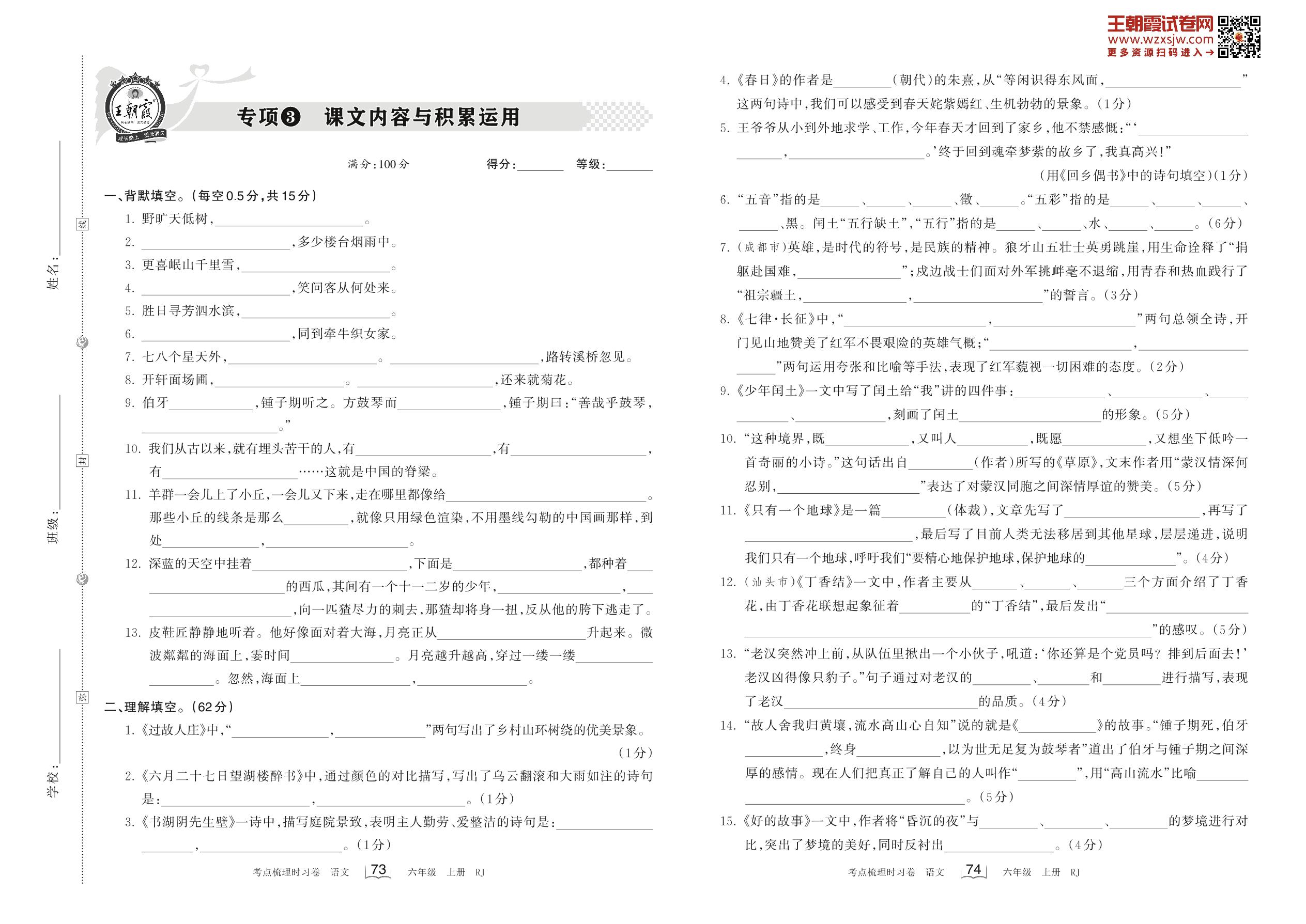 【易考突破】人教版·六年级上册·语文课文内容与积累运用专项训练