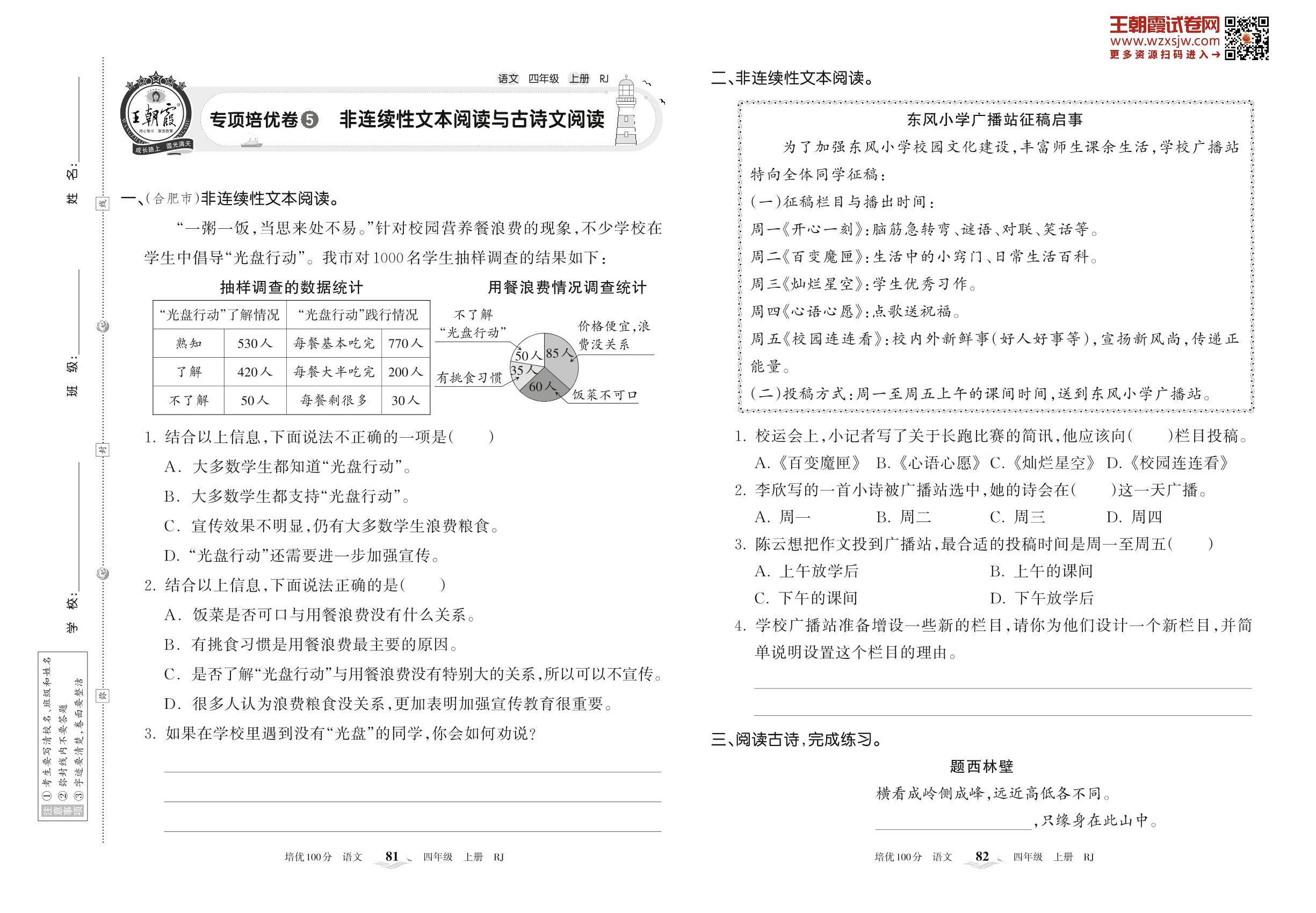 【易考突破】人教版·四年级·语文古诗文阅读与非连续性文本阅读专项训练