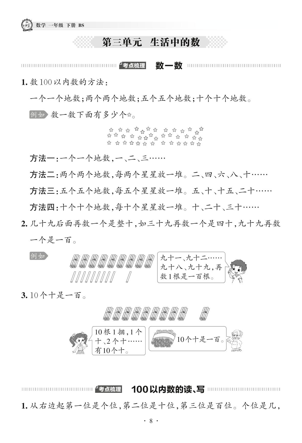 2022下册一年级数学北师版 考点梳理手册——第三单元 生活中的数