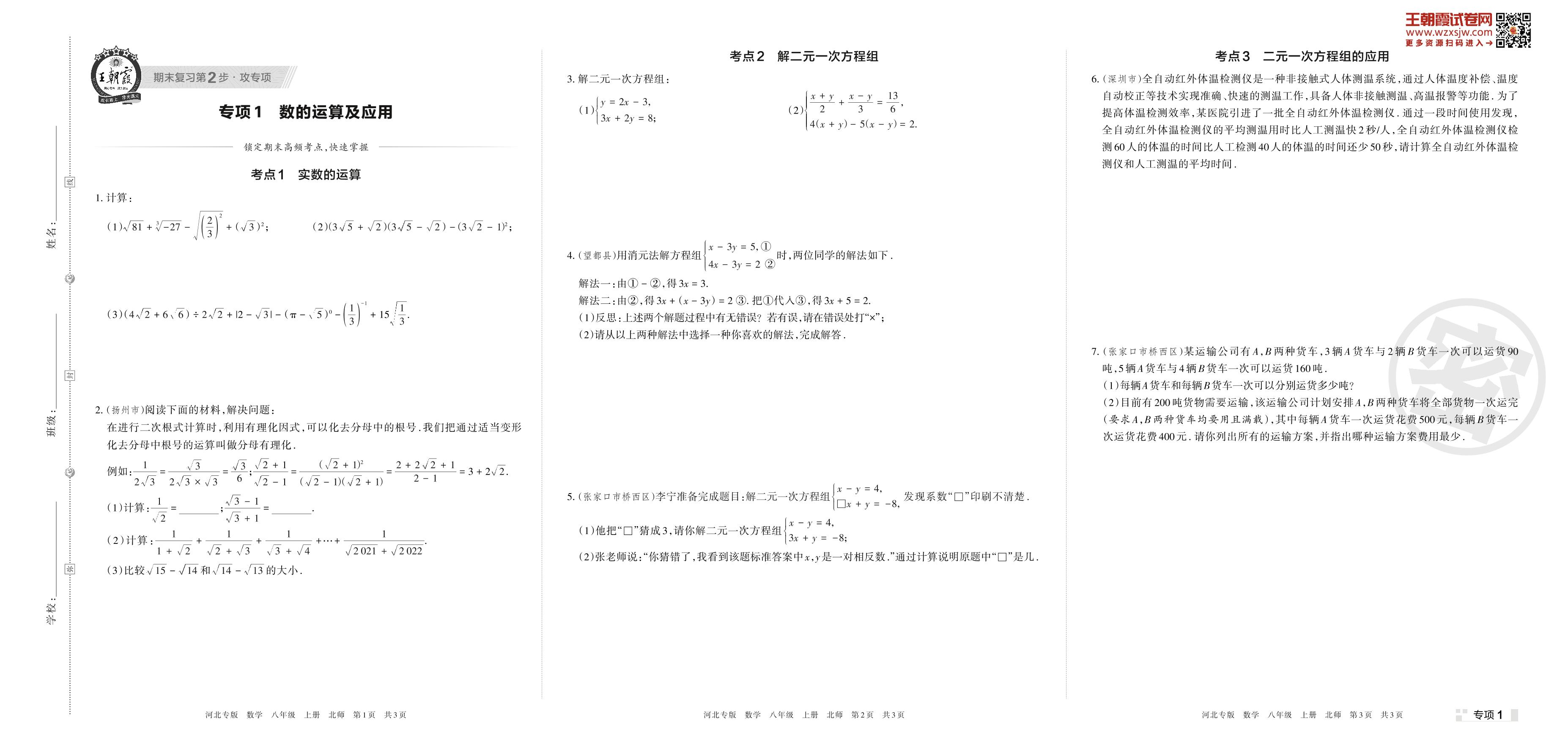 王朝霞期末专项卷——数的运算及应用八年级上册数学(北师版)【1】