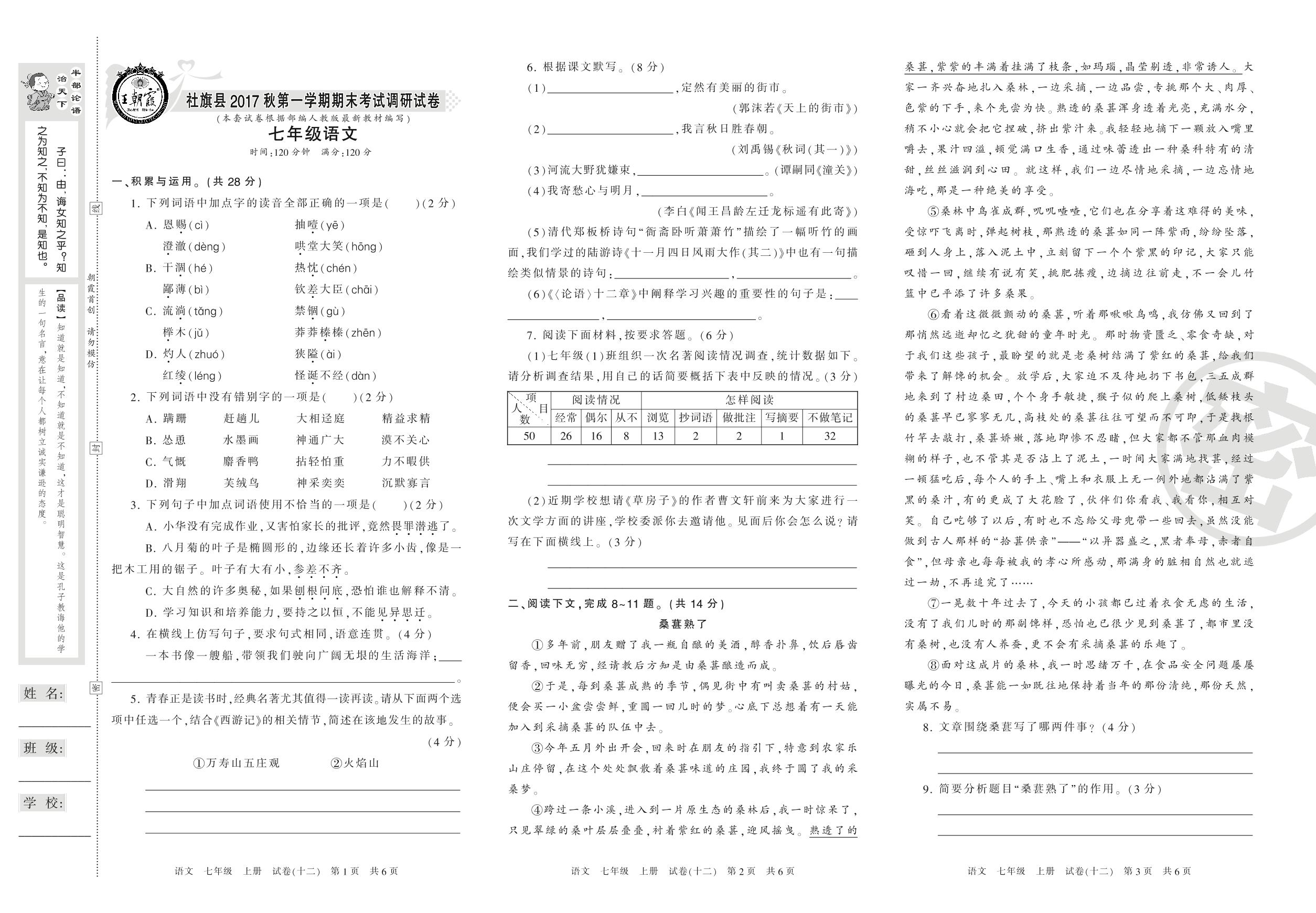 2016-2017学年第一学期南阳市社旗县七年级语文试卷(人教版)【12】