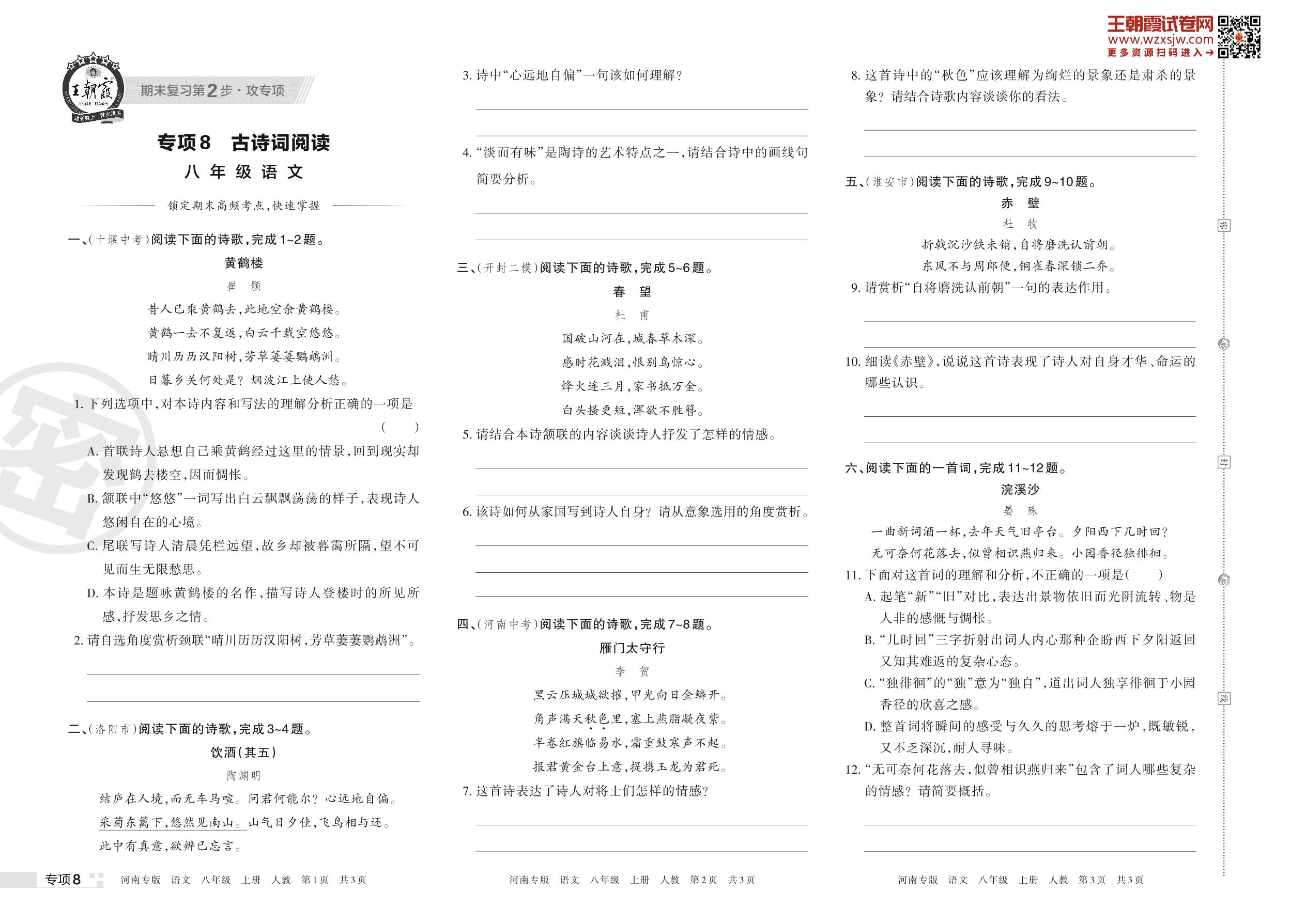 王朝霞期末专项卷——古诗词阅读八年级上册语文(人教版)【8】